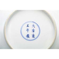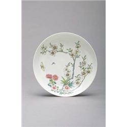 Superbly Famille Rose enameled, Chinese early 18th Century, Yung Cheng mark and of the period, porcelain dish of excellent form with delicate butterfly and floral design; D: 7 1/4"