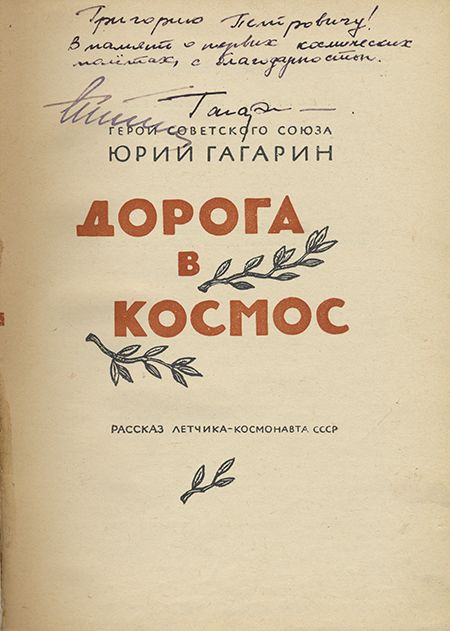 (1934 - 1968) Russian cosmonaut, the first man in space who died tragically in a routine training flight. Their signatures on the half title page of a Russian book on space honoring the first flight in 1961. Titov signs in brown ink, while Gagarin signs and adds a sentiment: "To Gregory Petrovich in memory of the first space flight, with thanks". Affixed to the first free endpaper is a vintage postcard of Gagarin, additionally signed and easily removed if desired. Wear to covers, interior pages a bit toned, otherwise very good condition.