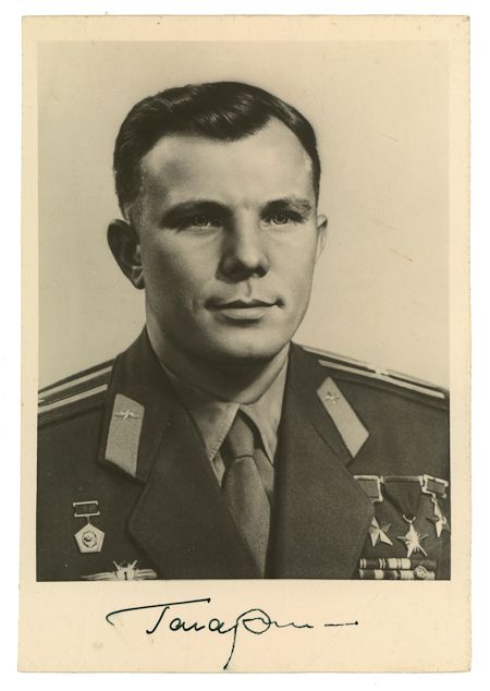 (1934 - 1968) Russian cosmonaut, the first man in space who died tragically in a routine training flight. S.P. 4" x 6" b/w, the classic head and shoulders portrait in uniform, boldly signed at bottom blank margin. Along with GEORGI BEREGOVOI, a small printed S.P. taken from a magazine, vertically signed at right and postal cover honoring the first visit of the Russian cosmonauts to the U.S., Houston, Oct. 21, 1969. Along with a small staple-bound volume entitled Yuri Gagarin (Novosti Agency Printing House, 1977), a "brief account of the eventful life of the brilliant Soviet spaceman...the world's first cosmonaut". Four pieces, very good condition.