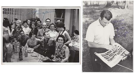 (1934 - 1968) Russian cosmonaut, the first man in space who died tragically in a routine training flight. A fine lot of three S.P.'s, including a 5 1/2" x 7 1/2" b/w informal image of Gagarin at a dinner party, mounted; a 5" x 7" b/w image of him reading a newspaper, and a 4" x 6" showing Gagarin departing a fishing dock holding his "catch of the day". Fine condition, three items.