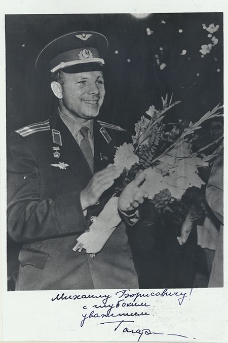 (1934 - 1968) Russian cosmonaut, the first man in space who died tragically in a routine training flight. I.S.P. 6" x 9" b/w, shows Gagarin in uniform receiving a bouquet of flowers. Boldly inscribed at bottom blank margin: "To Mikhail Borisovich with deep respect Gagarin". Light soiling at bottom does not detract, fine condition.