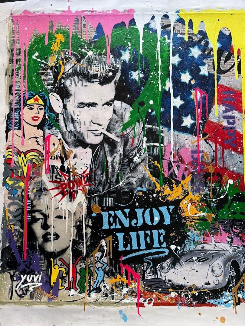 YUVI Enjoy Life ORIGINAL SIGNED. Artist: Yuvi - Title: Enjoy Life - Medium: Original Acrylic on Canvas - Signature: Hand-signed by the artist - Image Size: Approximately 37 inches x 32 inches - Framed: Stretched and framed ready to hang - Biography: Yuvi describes himself as a graffiti inspired pop artist saying: "The street as the graffiti artist's main source of inspiration makes the work accessible, authentic, and relatable." The animation and vibrancy in each work takes us straight back to the streets which inspired them, and has won him exhibitions and admirers in places as diverse as New York and New Delhi. - Yuvi combines traditional techniques with digital technology. His characters and their settings are formed from paint, printed paper cuttings, layers of old newspaper clippings, sketches, silk screen prints, various glues, inks, spray paints, sand, glass fragments and more. He often uses his bare hands which means he has an intense physical relationship with every piece he creates; to look at his hands after a day in his studio is to understand his dedication, passion, and love for his work. The finished composition is intensely tactile and the spectator is invited to feel the work with their hands. - Warranty: Item GUARANTEED to be as described