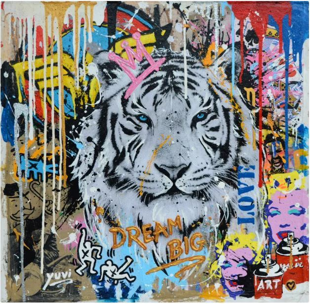 YUVI LION KING ORIGINAL SIGNED. Artist: Yuvi - Title: Lion King - Medium: Original Acrylic on Canvas - Signature: Hand-signed by the artist - Image Size: Approximately 25 inches x 25 inches - Framed: Stretched and framed ready to hang- Biography: Yuvi describes himself as a graffiti inspired pop artist saying: "The street as the graffiti artist's main source of inspiration makes the work accessible, authentic, and relatable." The animation and vibrancy in each work takes us straight back to the streets which inspired them, and has won him exhibitions and admirers in places as diverse as New York and New Delhi. - Yuvi combines traditional techniques with digital technology. His characters and their settings are formed from paint, printed paper cuttings, layers of old newspaper clippings, sketches, silk screen prints, various glues, inks, spray paints, sand, glass fragments and more. He often uses his bare hands which means he has an intense physical relationship with every piece he creates; to look at his hands after a day in his studio is to understand his dedication, passion, and love for his work. The finished composition is intensely tactile and the spectator is invited to feel the work with their hands. - Warranty: Item GUARANTEED to be as described