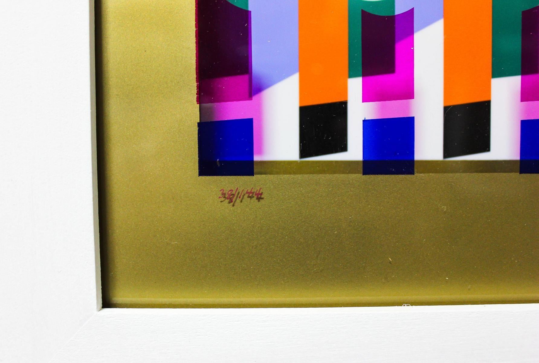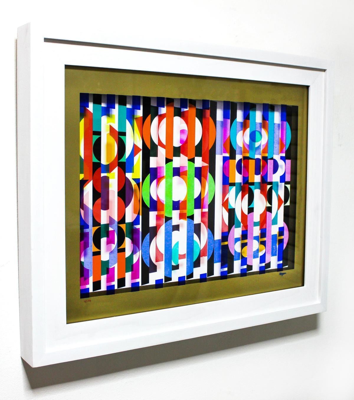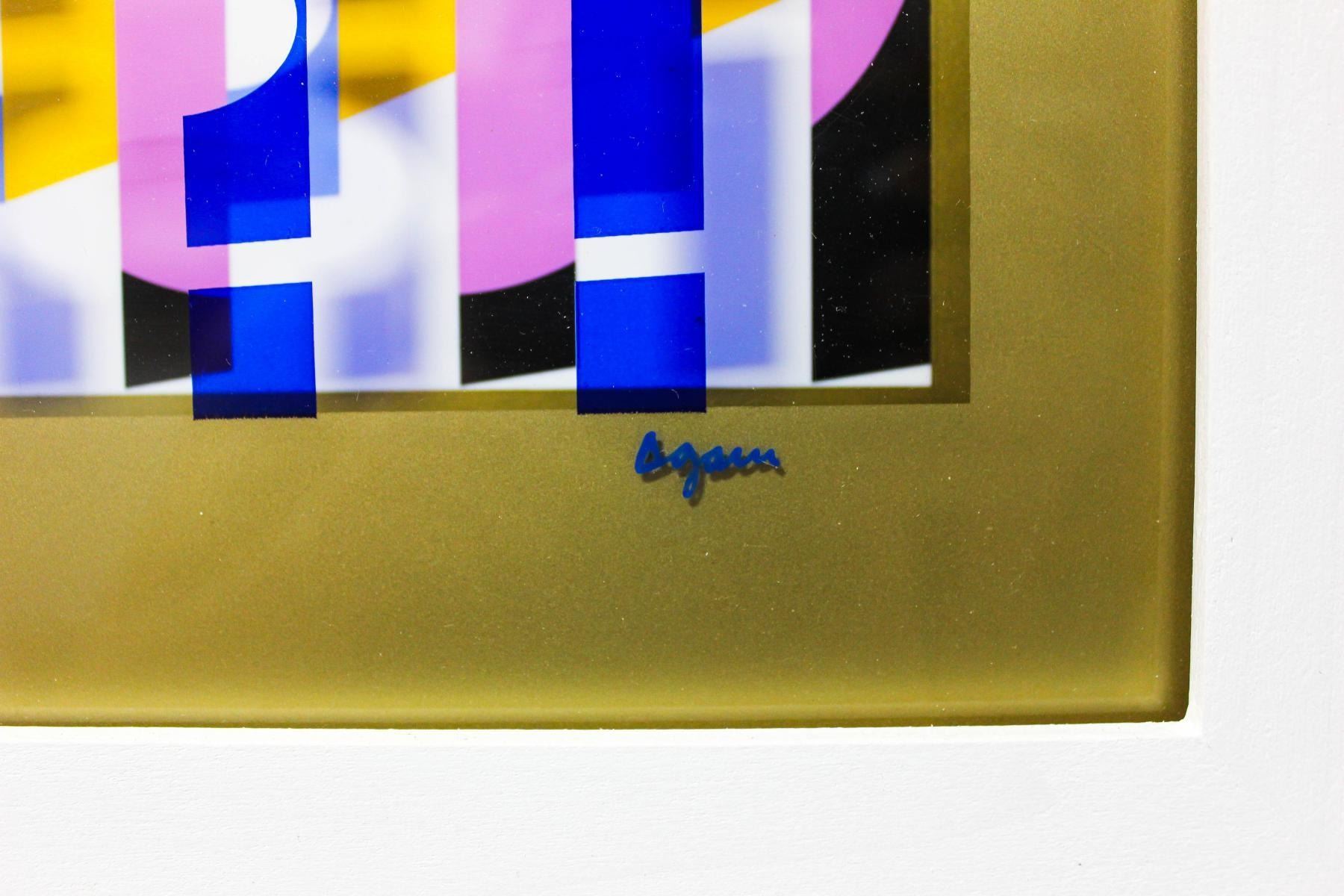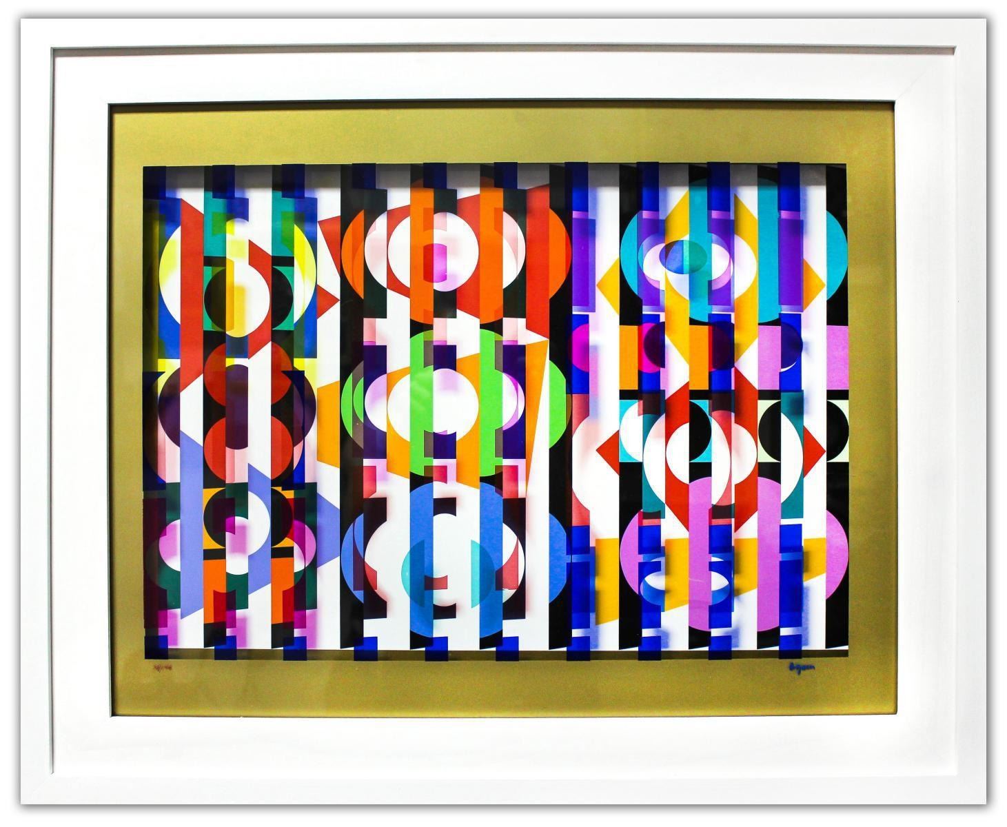 Artist: Yaacov Agam. Medium: Multigraph. Title: Untitled. Size (Unframed): 16" x 20". Size (Framed): 20" x 24". Certificate of Authenticity: Is included. Additional: This item is framed with a slide-able image. The top image can slide manually in the track inside the frame.. Reference# 15434.