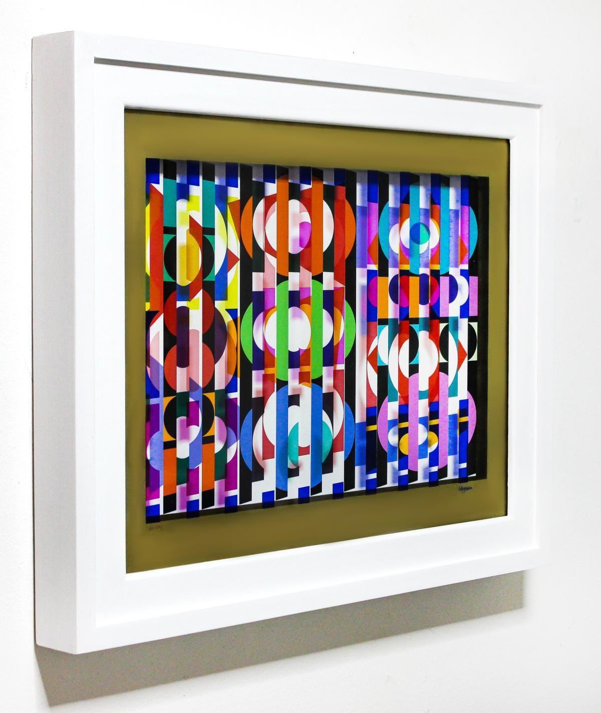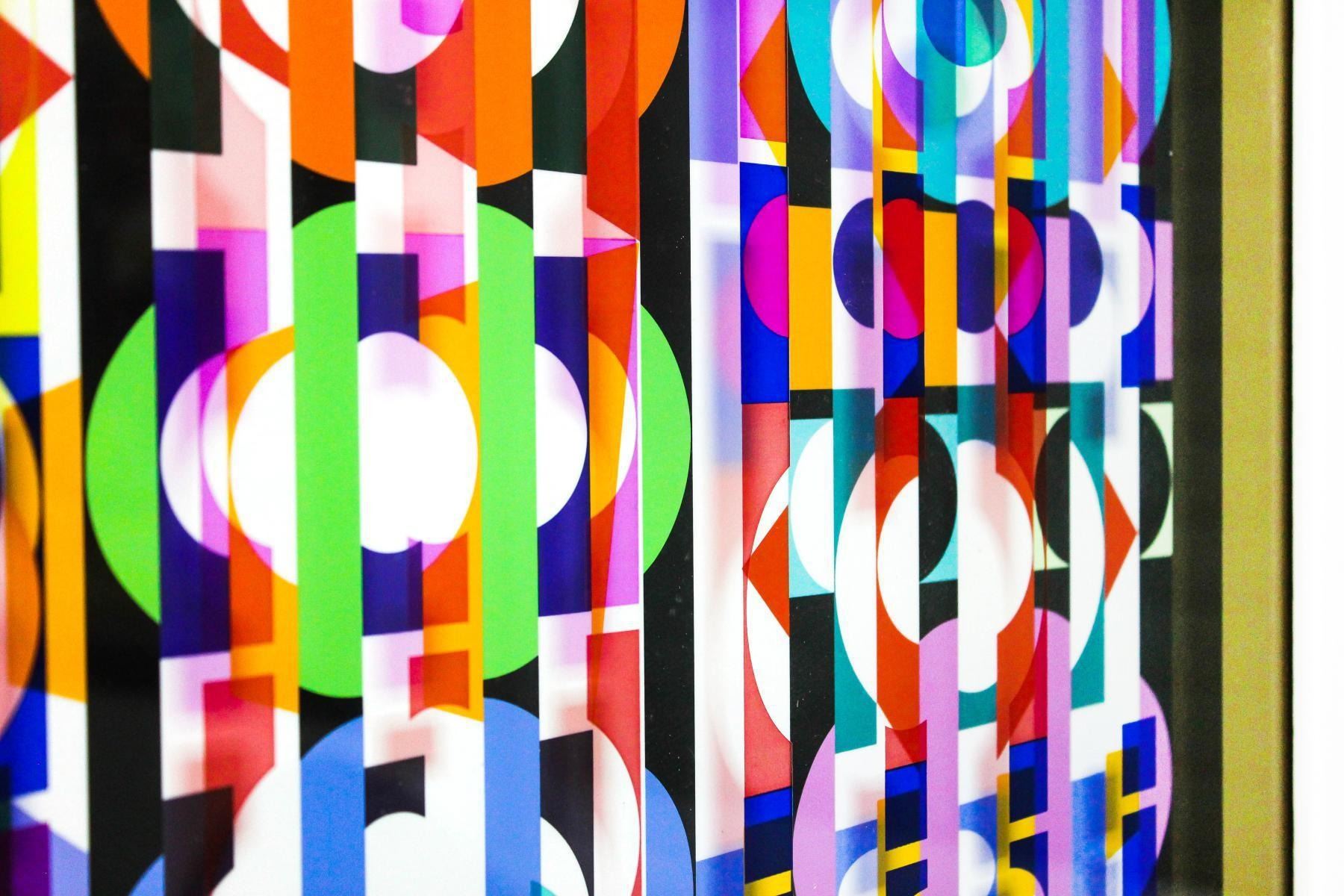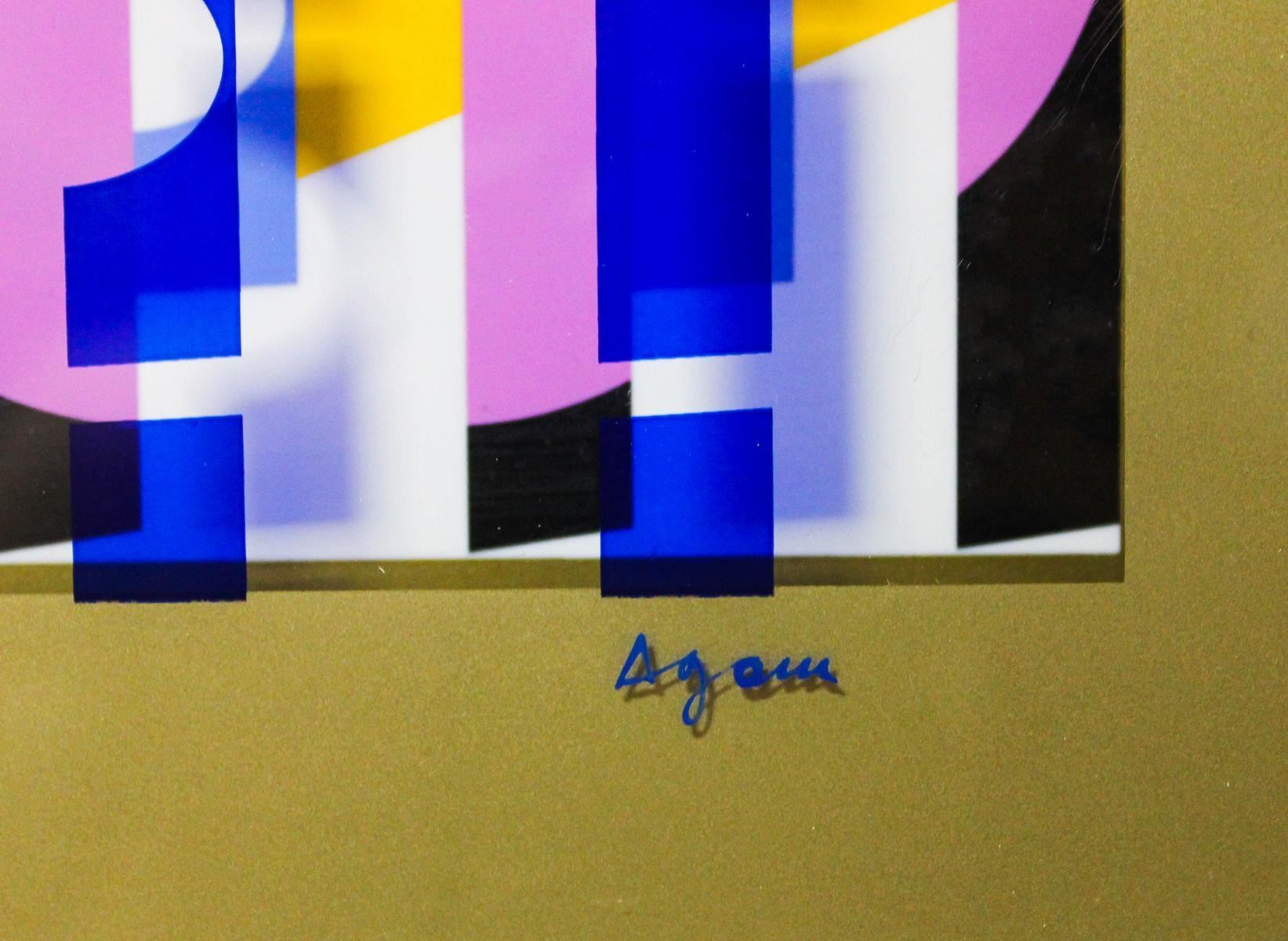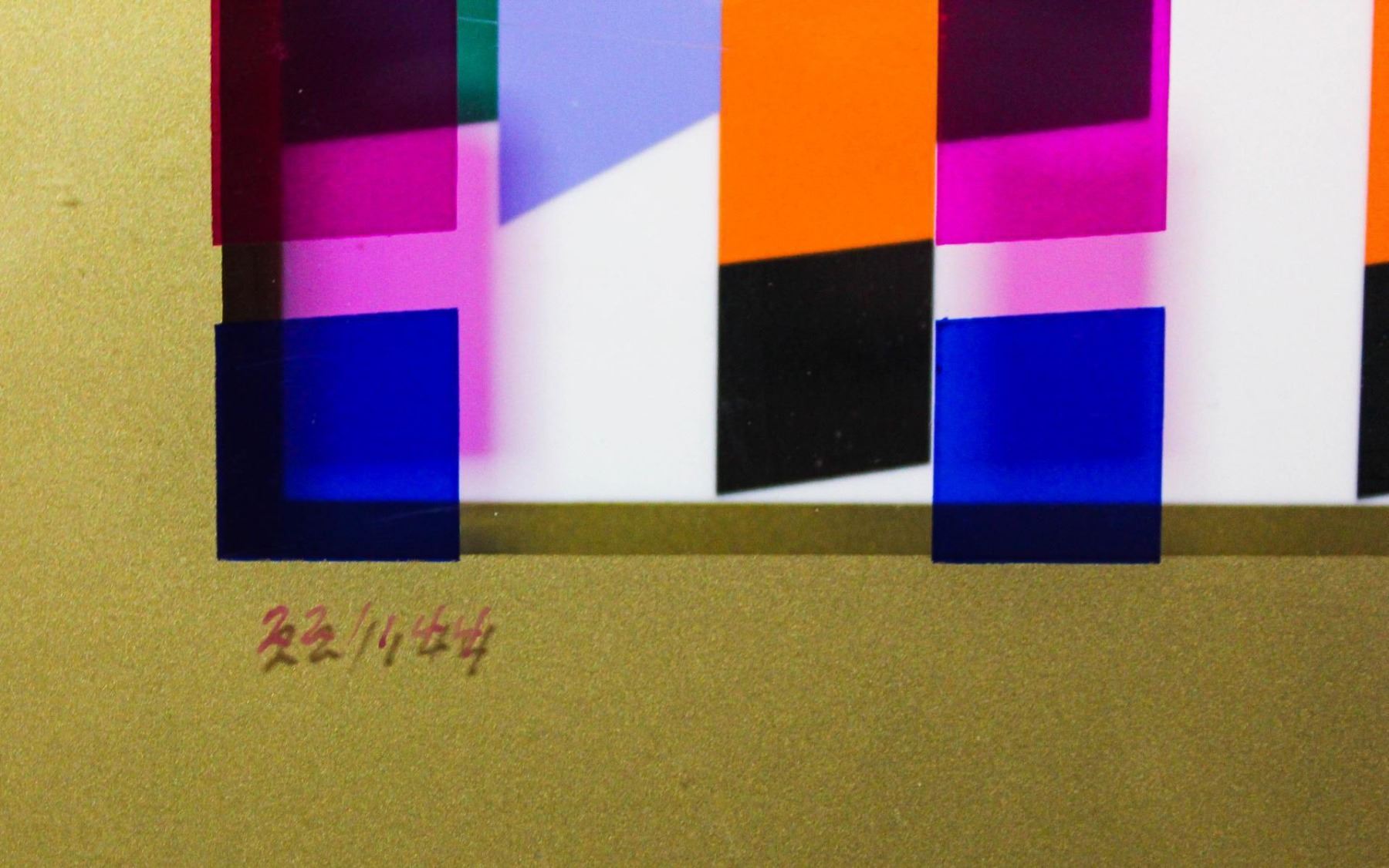 Artist: Yaacov Agam. Medium: Multigraph. Title: Untitled. Size (Unframed): 16" x 20". Size (Framed): 20.5" x 25". Certificate of Authenticity: Is included. Additional: This item is framed with a slide-able image. The top image can slide manually in the track inside the frame.. Reference# 16317.