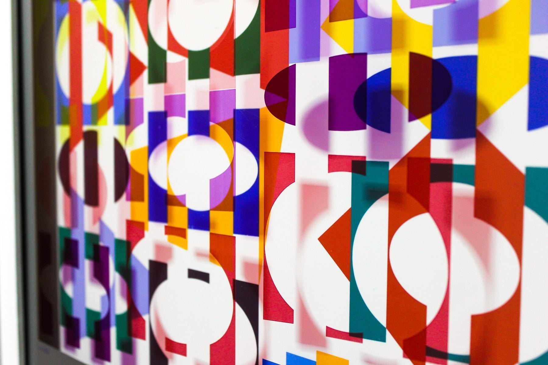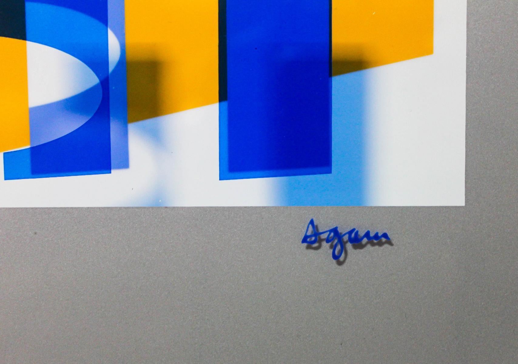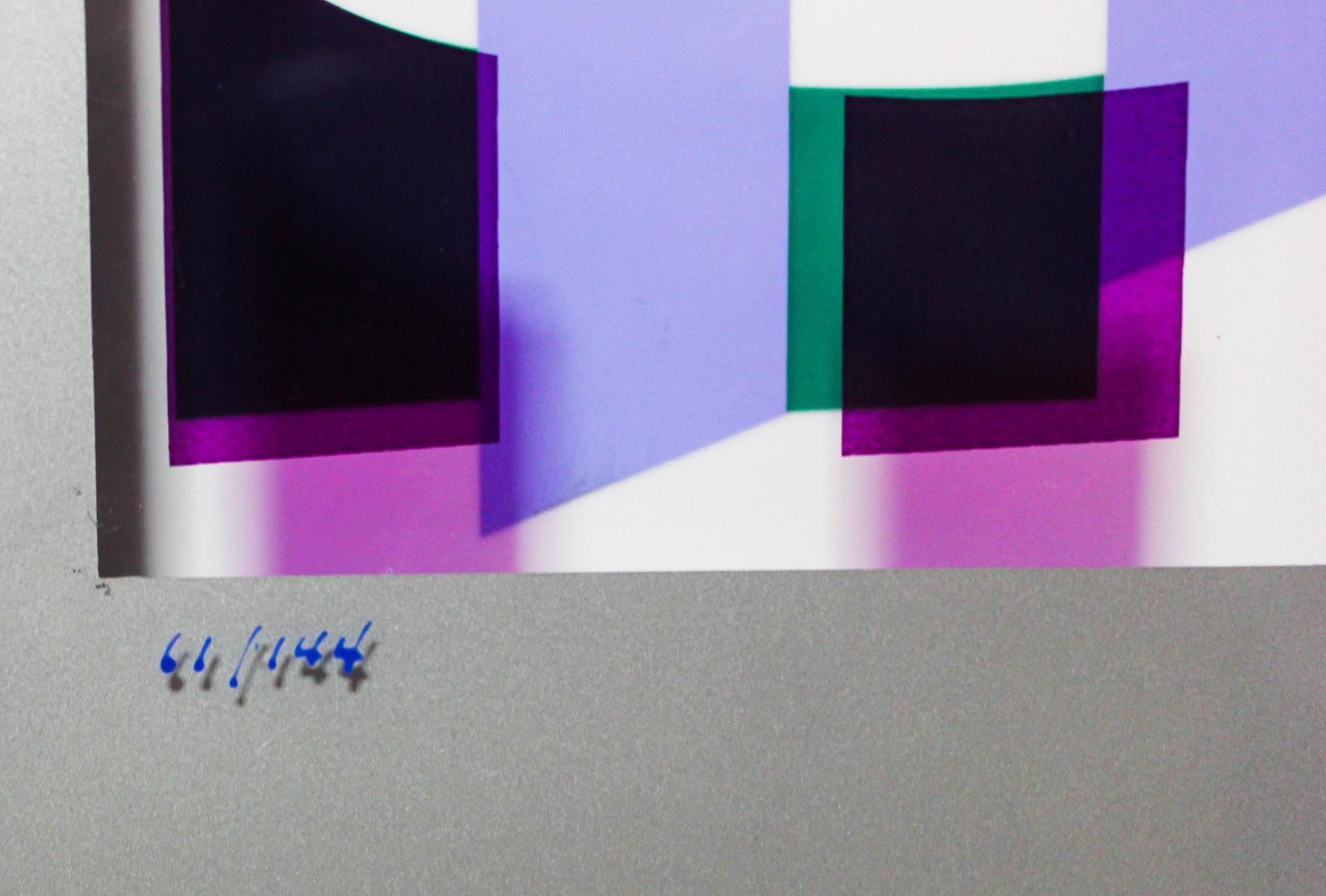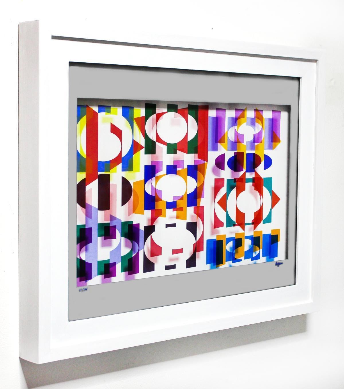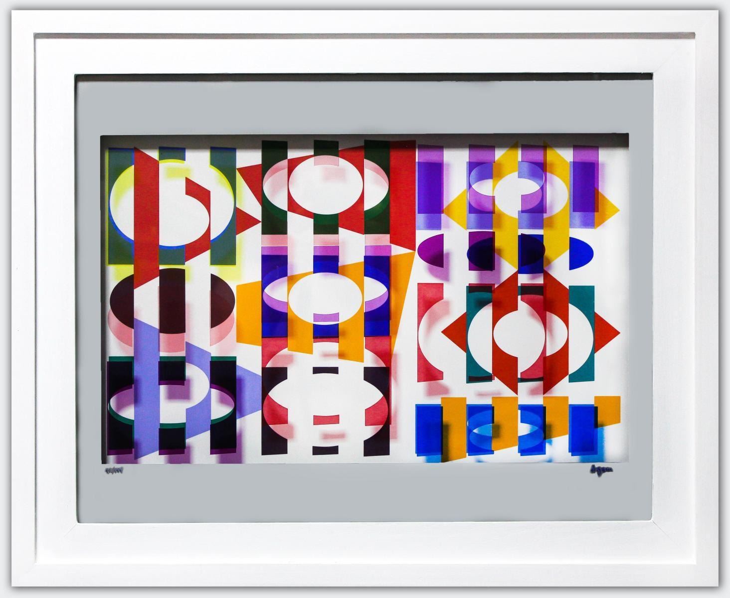 Artist: Yaacov Agam. Medium: Multigraph. Title: Untitled. Size (Unframed): 16" x 20". Size (Framed): 20" x 24.5". Certificate of Authenticity: Is included. Additional: This item is framed with a slide-able image. The top image can slide manually in the track inside the frame.. Reference# 16366.