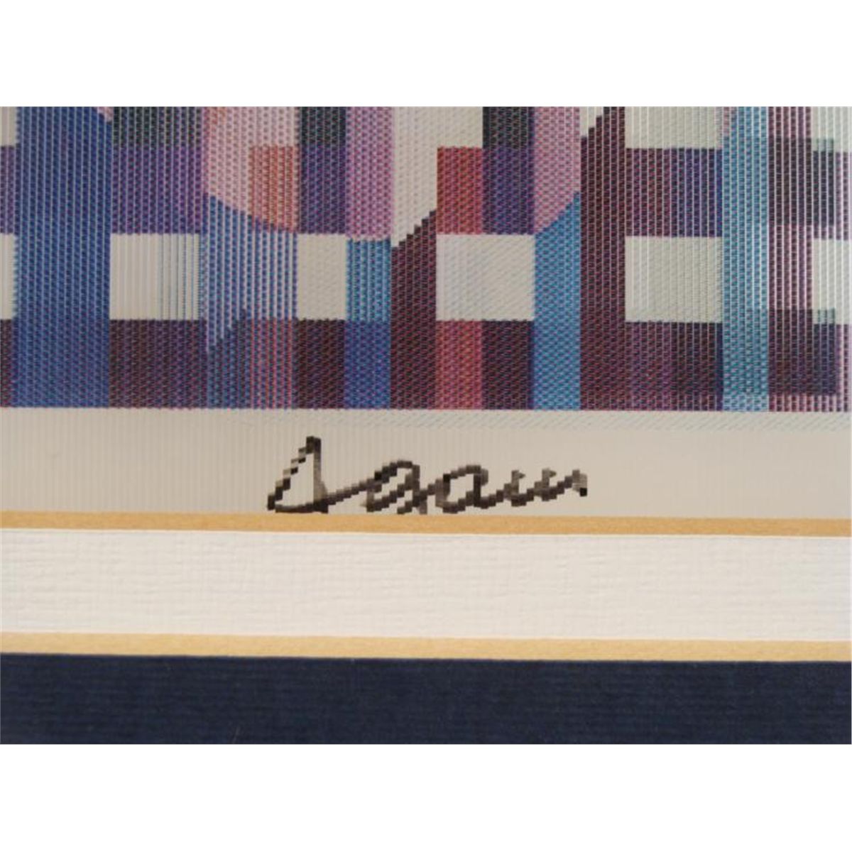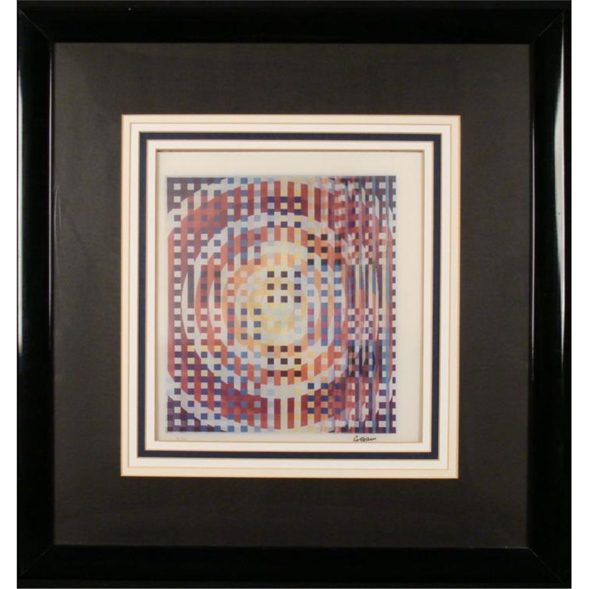 Artist: Yaacov AgamSignature: In ink, lower rightEdition: Limited 96/99Medium: Original color AgamographImage size: 10 1/2 x 11 1/2 inchesFraming: In 5 layer matting in black and white, in black laminate frameFrame size: 25 1/4 x 26 1/4 inches Condition: Excellent; needs to be repositioned in matte Biography: * * Israeli-born Yaacov Agam (1928 - ) was educated at the Bezalel School of Art in Jerusalem and the Atelier d'Art Abstrait in Paris. Among the awards he has received are a special prize for art research at the Sao Paulo Bienal in 1963 and first prize at the International Festival of Painting at Cagnes-surmer in 1970. Agam has had exhibitions at the Tel Aviv Museum, the Musee National d'Art Moderne in Paris, and the Stedelijk Museum in Amsterdam. His work is in the collections of many museums, including the Museum of Modern Art in New York and the Joseph Hirshhorn Collection in Washington, D.C. *