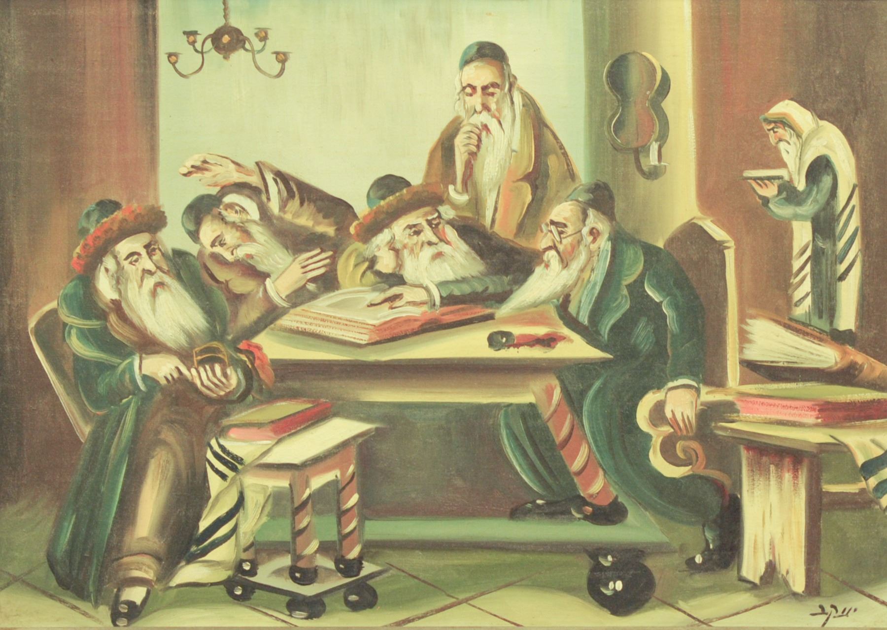 Yaacov, Talmudic argument, oil on canvas, signed, framed, dimenions: 70x50 cm.