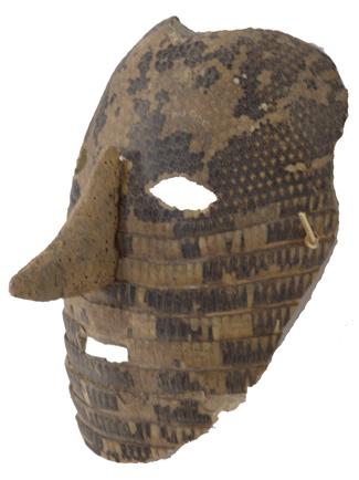 Traditional hard armadillo skin mask with cutout eyes and mouth and carved wooden nose. 11" x 11"