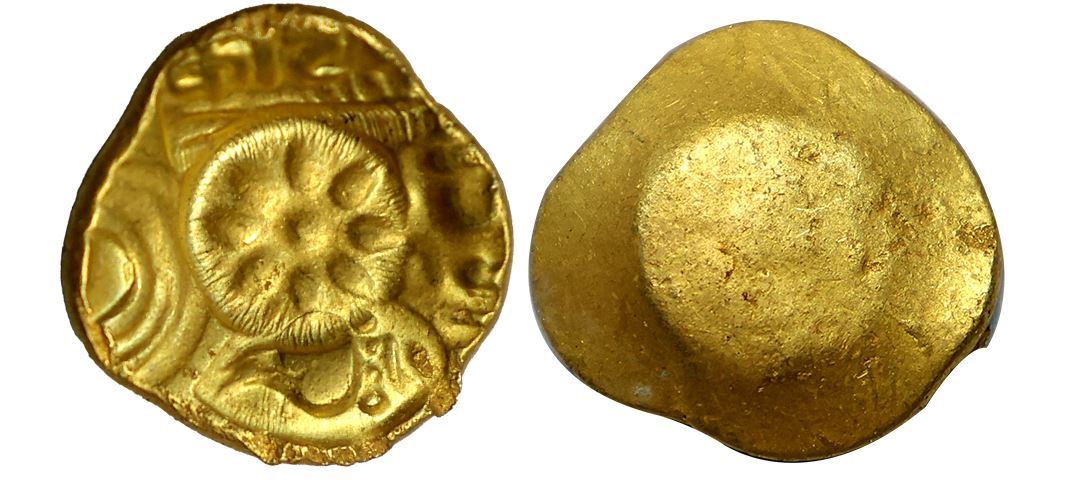 Yadavas of Devagiri, Krishna (Kanhara) Deva (1247-1261 AD), Gold Gadyana 'Padma Tanka', 3.82 gms, Punch marked type with five punches on obv 1 punch of a lotus in centre 2 punches of Kannada letter ‘Shri’, 1 punch of Shankha or Conch shell and 1 punch of Devnagari legend ‘Kanhara’ with a sword below, K. Ganesh, Karnataka Coins 7.11, very fine, rare.