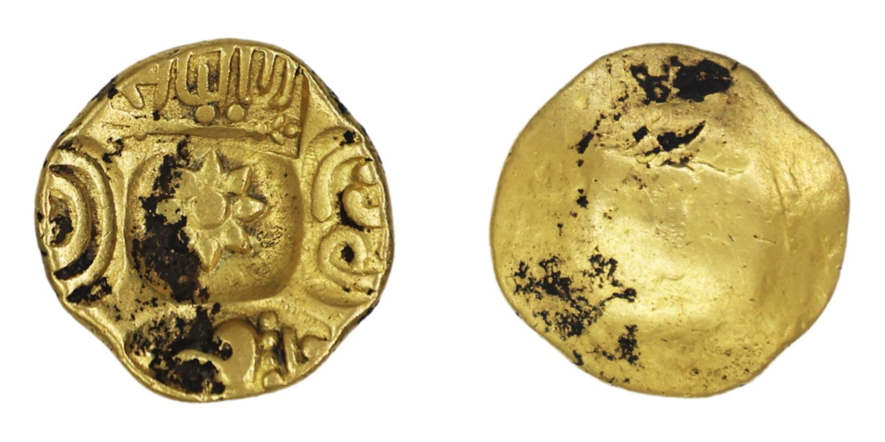 Yadavas of Devagiri, Singhana Deva (c. 1115-1145 AD), Gold Gadyana / Padma Tanka, 3.74g, 16.24mm, Punch-marked type, with five punches on obv., 1 punch of a lotus in centre, 2 punches of Kannada letter ‘Shri’, 1 punch of Shankha or Conch shell and 1 punch of Devnagari legend ‘Singhana’ on top, Uniface (Mitch K& amp;A 287).Very Fine. Scarce.