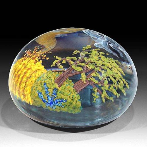 Yaffa Todd and Jeffrey Todd 2003 "Stormy" weight from the Nature series, with a tornado, touching down near two wind-blown trees, growing from a green field, dotted with blue and yellow flowers. Signed/dated. Edition number 1 of a limited edition of 30. Diameter 3 1/8".