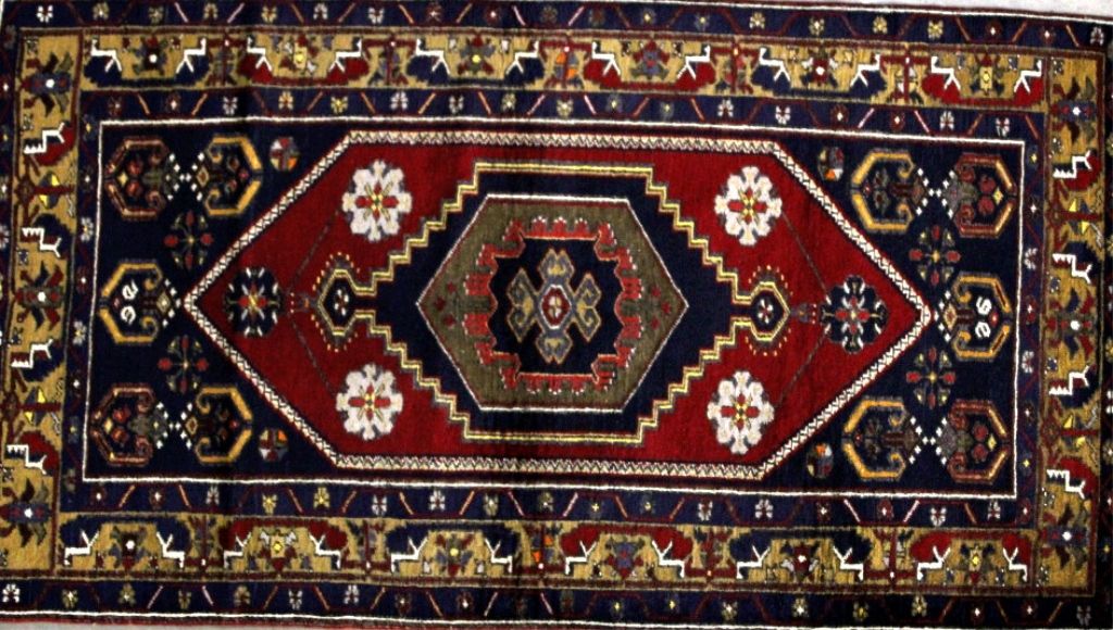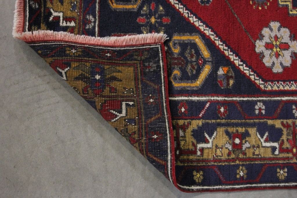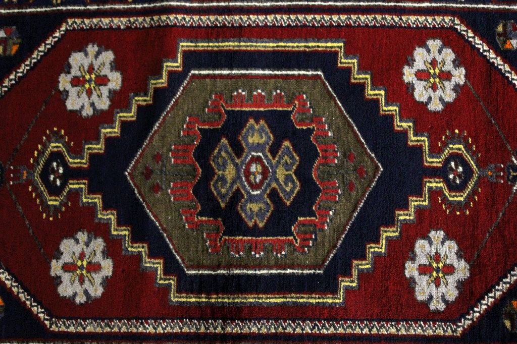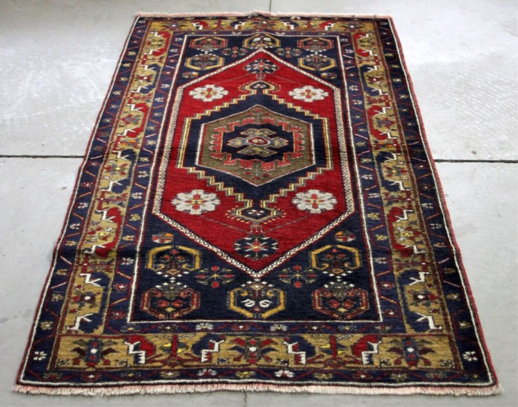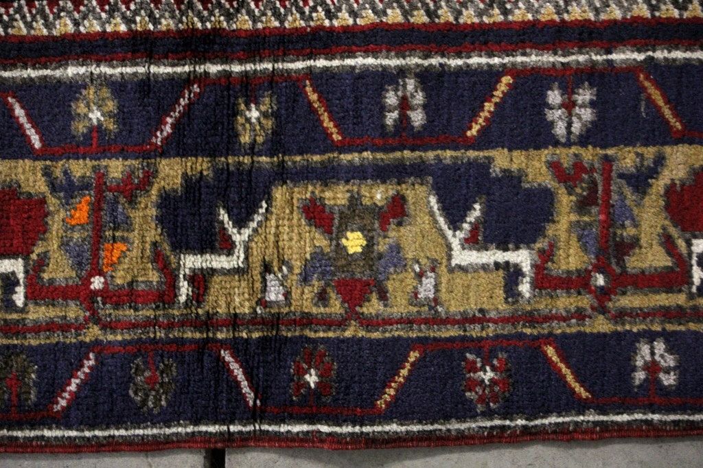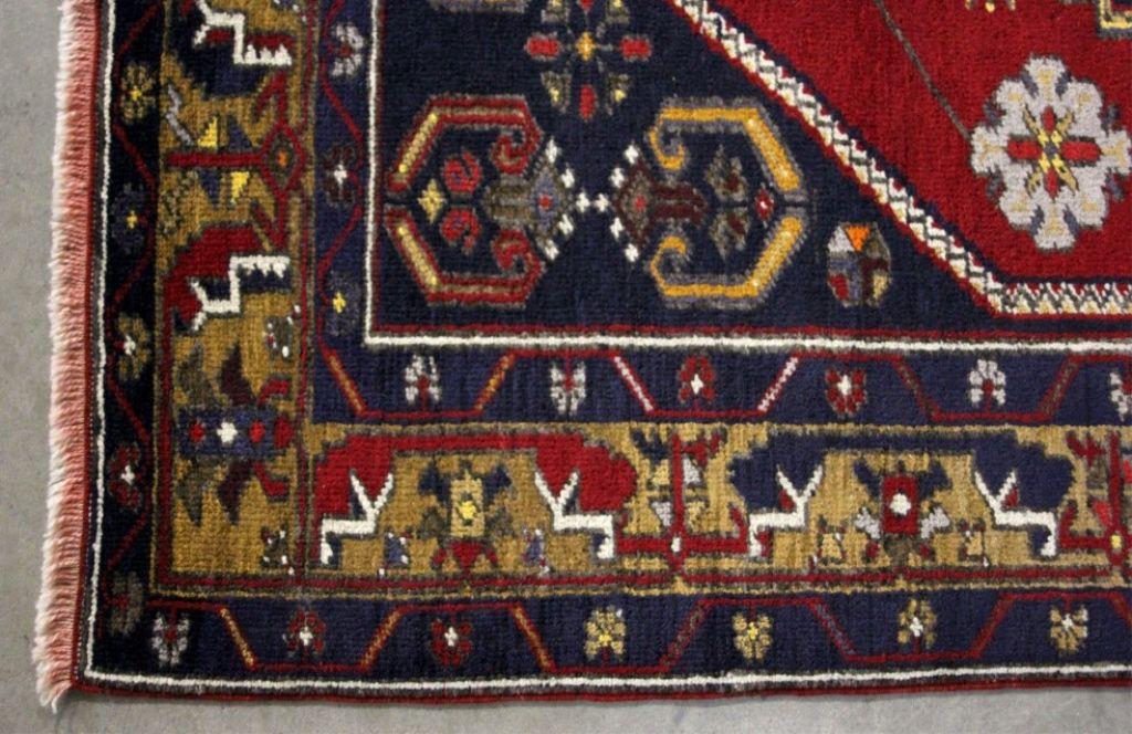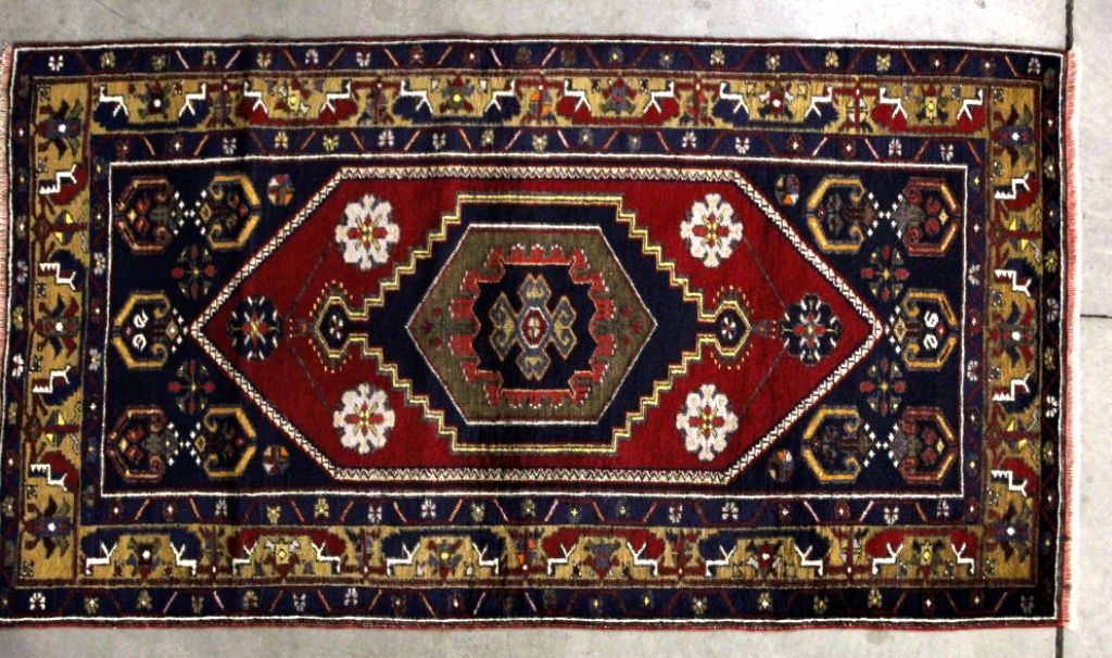 This is a hand knotted rug from Yahyalý, Central Anatolian (Cappadocia) region, Turkey. The rug is made with traditional wool on wool 100% and is hand dyed with organic dyes. The piece has a wonderful design and isfrom the 1950's. The rug shows dyes such as saffron, root of the wild madder, and more. Anatolian women and girls transpose all their feelings and thoughts onto their carpets by transforming the knots into motifs andattributing certain meanings to each one of them. Yahyalý carpets are no exception. One of the most important carpet weaving centers in Cappadocia, Yahyali's weavers use deep color like dark red and dark blue. Thesecarpets are renowned for a balanced distribution of motifs, their unique wool and quality craftsmenship. Natural dyes used in Yahyali are those produced from wine leaves, wild mint, walnut shell and buckthon. Thispiece is in excellent condition. The rug measures 77"x41.5"