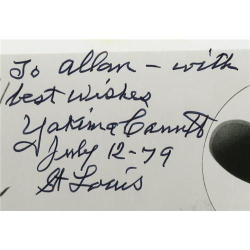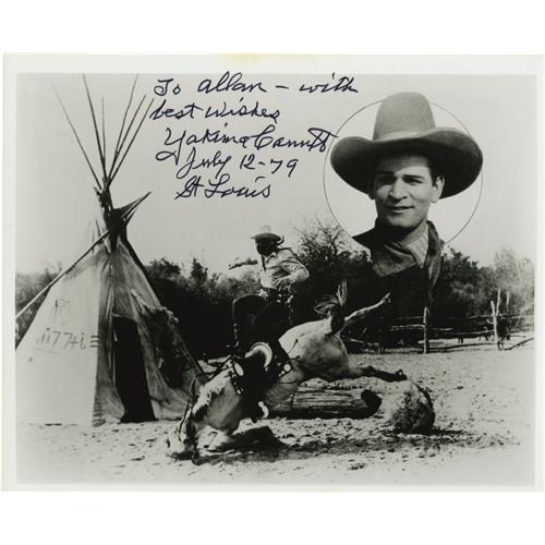 <B>Yakima Canutt Signed Photo.</B></I> A b&w 8" x 10" photo inscribed and signed by the legendary stunt man in black ink. In Excellent condition with a little tanning to the top edge. <I>Accompanied by LOA from PSA/DNA.</B></I><BR><BR><b>Shipping:</b> Flat Material, Small (<a target="_blank" href="http://www.heritageauctions.com/common/shipping.php">view shipping information</a>) <BR><BR><B>Important notice