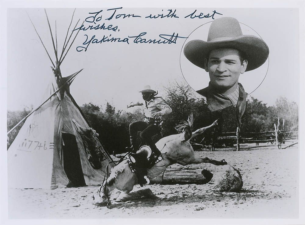 Glossy 10 x 8 composite photo of the stuntman in action, signed and inscribed in black felt tip “To Tom with best wishes, Yakima Canutt.” In fine condition.