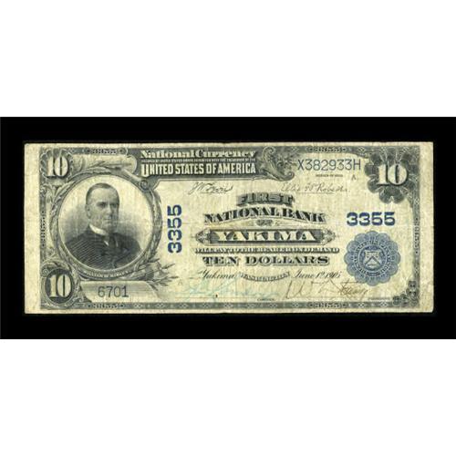 <B>Yakima, WA</B></I> - $10 1902 Plain Back Fr. 624 <B>First NB</B></I> Ch. # 3355<BR> This is one of only three large notes reported for this bank. Pleasing <B>Fine,</B></I> likely to see bidding easily reach and perhaps well exceed... <BR><BR><b>Shipping:</b> Coins & Currency (<a target="_blank" href="http://www.heritageauctions.com/common/shipping.php">view shipping information</a>)