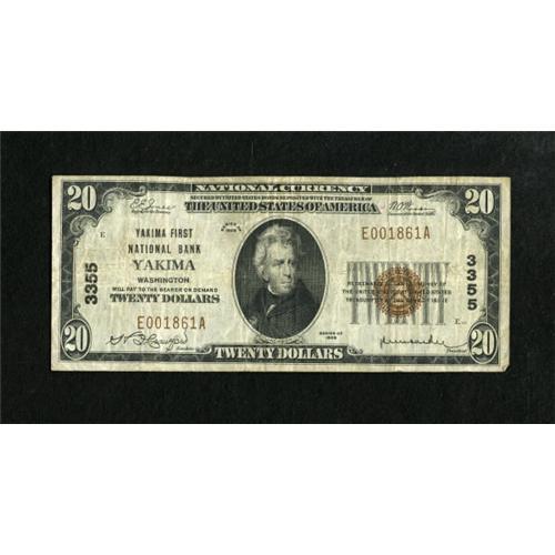 <B>Yakima, WA</B></I> - $20 1929 Ty. 1 <B>First NB</B></I> Ch. # 3355<BR> An attractive and fully margined note that has all the originality one would like from a mid-grade issue. <B>Very Fine.</B></I><BR><I>From The Walla Walla Collection</B></I><BR><BR><b>Shipping:</b> Coins & Currency (<a target="_blank" href="http://www.heritageauctions.com/common/shipping.php">view shipping information</a>)