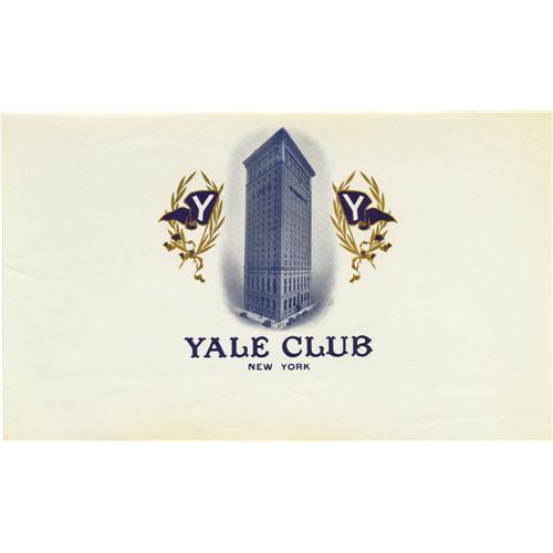 <B><I>Yale Club of New York</B></I></B></I> <B>Cigar Label.</B></I> A printed 10" x 6" inner label with a simple design: a blue monotone image of the famous Yale Club with cars parked at the curb and blue and gold "Y" banners on either side. This is the current club located at 50 Vanderbilt Avenue in midtown Manhattan. The first club was founded in 1897 in a rented brownstone at 17 East 26th. The next location was a 12-story building built in 1901 at 30 West 44th. The current 23-story clubhouse pictured here was designed by architect James Gamble Rogers (a Yale alumnus, of course) and opened in 1915 as the largest college clubhouse in the world (it still is). There are currently 10,000 members, 140 guestrooms, and three restaurants. There have been an amazing group of famous and talented people pass through this building in its nearly 90-year history. A "must-have" for any Yale alumnus. Excellent condition with just slight handling.<BR><BR><b>Shipping:</b> Small Flat (<a target="_blank" href="http://www.heritageauctions.com/common/shipping.php">view shipping information</a>)