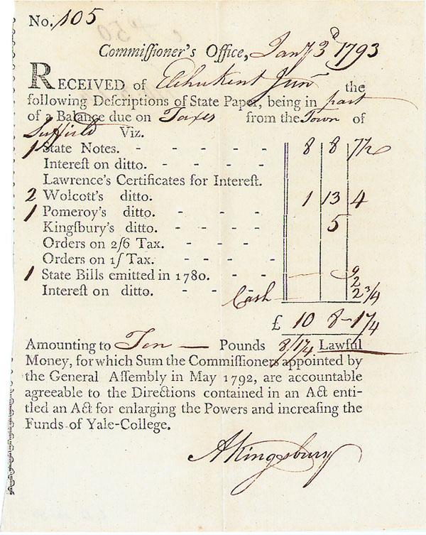 1794, Connecticut. Commissioner's Office certificate of transfer of old notes "being in part of a Balance due on Taxes amounting to seventy-four pounds 1/8 Lawful Money, for which Sum the Commissioners appointed by the General Assembly in May 1793, are accountable agreeable to the Directions contained in an Act entitled an Act for enlarging the Powers and increasing the Funds of Yale-College." The amounts of the various notes issued by previous treasurers are listed. Excellent