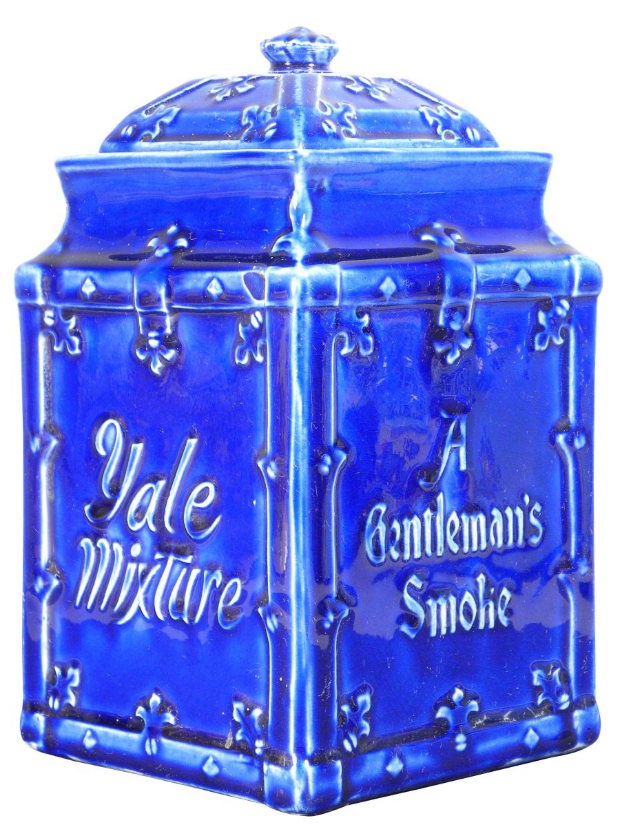 Yale Mixture Tobacco Humidor, cobalt blue stoneware. Minor chip on the inner lip otherwise excellent condition. 5 X 8 X 5 inches.