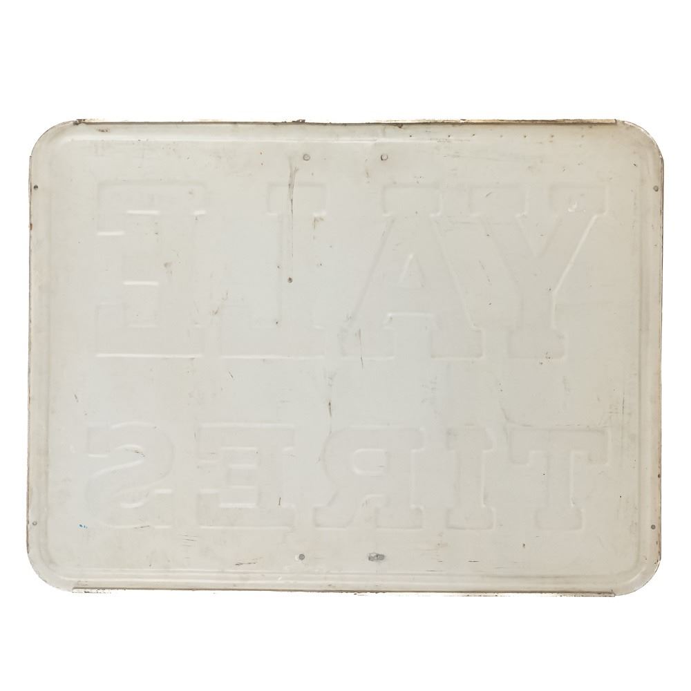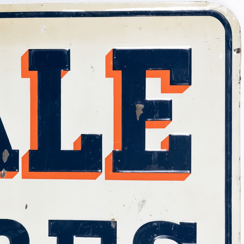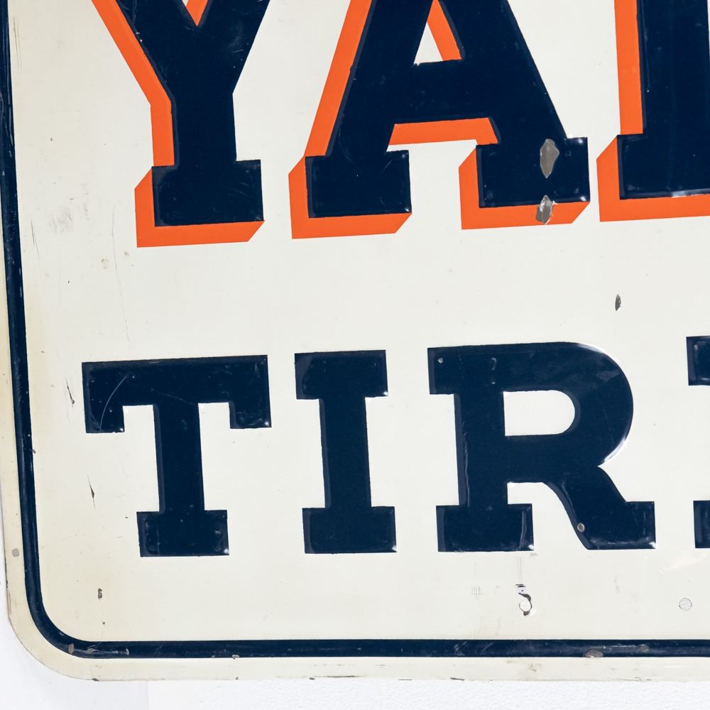 Vintage "YALE TIRES" embossed single sided metal advertising sign. Presents well and in good overall condition with some discoloration, stray marks, paint loss and oxidation. Approximately 26.5"t x 35"w. Please use photos to judge condition and bid accordingly.