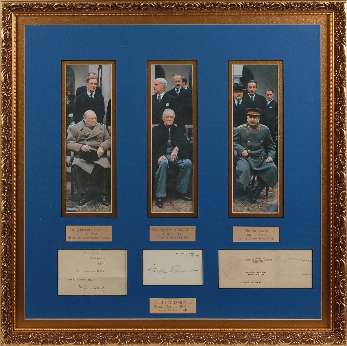 Incredible framed presentation of signatures from the three leaders who met at the historic 1945 Yalta Conference, Winston Churchill. Franklin D. Roosevelt, and Joseph Stalin: a 4.5 x 3 slip dated October 7, 1948, signed "W. Churchill"; a 4 x 2.25 White House card, signed "Franklin D. Roosevelt"; and a 6 x 2.75 slip clipped from a Stalin Prize certificate with USSR seal, signed "J. Stalin," and also signed by "Y. Chadev" of the Council of the People's Commissars. Beautifully double-matted and framed with plaques and color portraits of the leaders at the Yalta Conference to an overall size of 22.5 x 22.5. In fine condition, with each signature slightly faded from prior display. While Churchill and Roosevelt are readily obtainable, Stalin's signature remains exceedingly scarce; this example was clipped from the prestigious Stalin Prize, which existed from 1941 to 1954 and was one of the Soviet Union’s highest honors. A remarkable display commemorating the historic Yalta Conference, during which the three Allied leaders met to discuss Europe's postwar future. Pre-certified PSA/DNA.