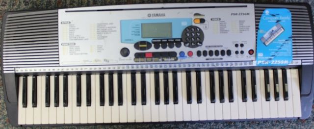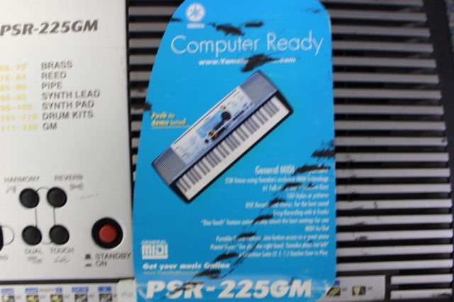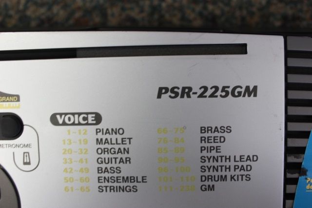 Yamaha PSR-225GM in good condition. Perfect for learning to play and light recording. The PSR-225GM is a 61-key Touch Response keyboard with incredible sound quality. It features 238 different voices including Yamaha's signature Portable Grandâ„¢ piano sound as well as GM compatible voices. 100 accompaniment styles provide a world of melody. Learn to play with the built-in Yamaha Education Suite. Play along with any one of 100 built-in songs. A six-track sequencer makes it possible to create multi-track compositions. Built-in speakers make it truly portable. The PSR-225GM is ideal for future piano players on a budget. Can be played with with batteries and also works with cord that can be bought at any local radio shack.