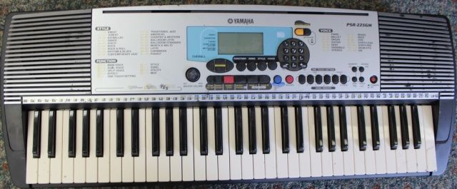 Yamaha PSR-225GM in good condition. Perfect for learning to play and light recording. The PSR-225GM is a 61-key Touch Response keyboard with incredible sound quality. It features 238 different voices including Yamaha's signature Portable Grandâ„¢ piano sound as well as GM compatible voices. 100 accompaniment styles provide a world of melody. Learn to play with the built-in Yamaha Education Suite. Play along with any one of 100 built-in songs. A six-track sequencer makes it possible to create multi-track compositions. Built-in speakers make it truly portable. The PSR-225GM is ideal for future piano players on a budget. Can be played with with batteries and also works with cord that can be bought at any local radio shack.
