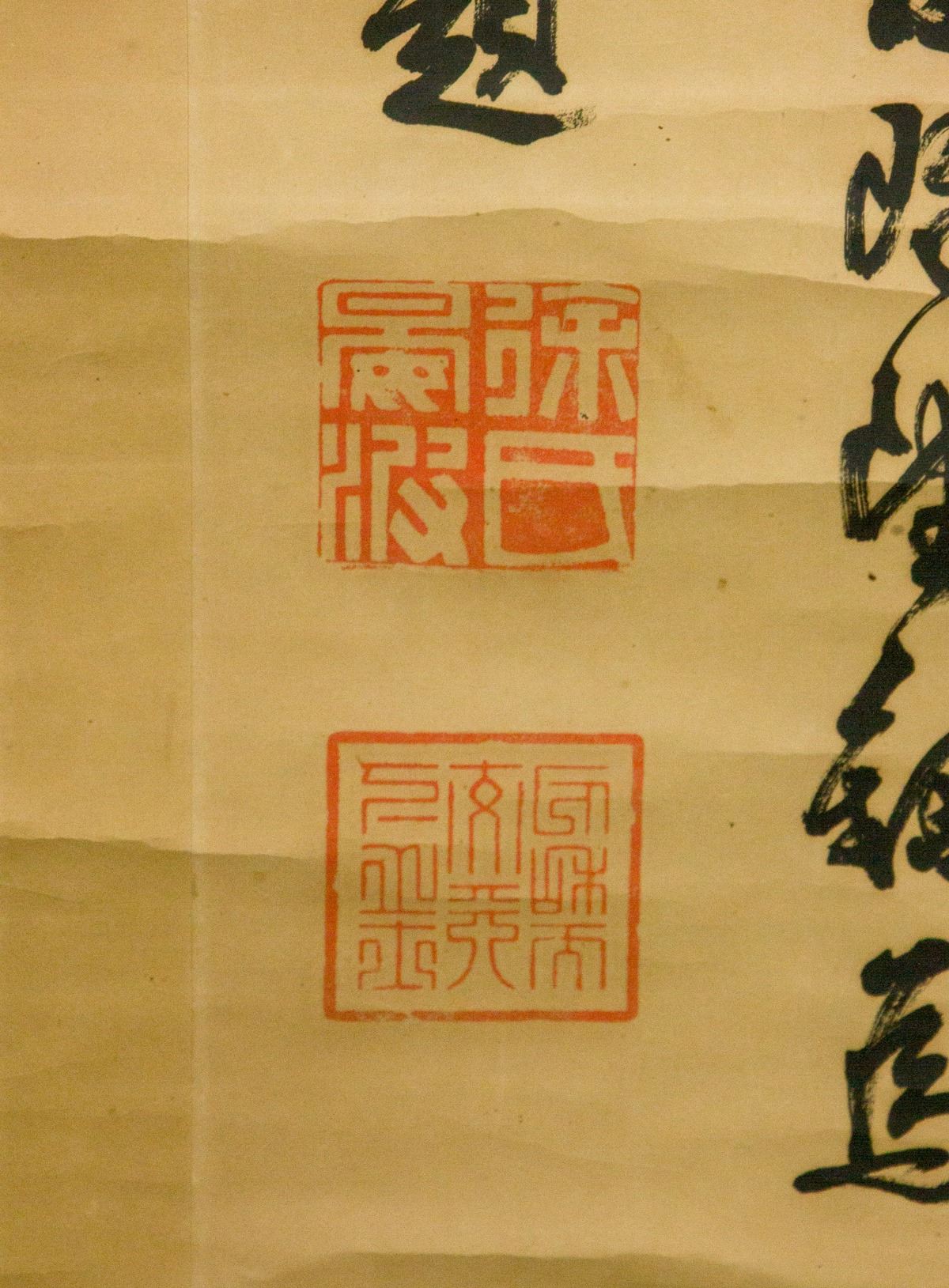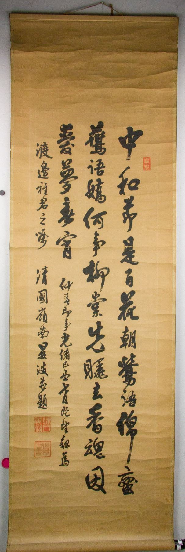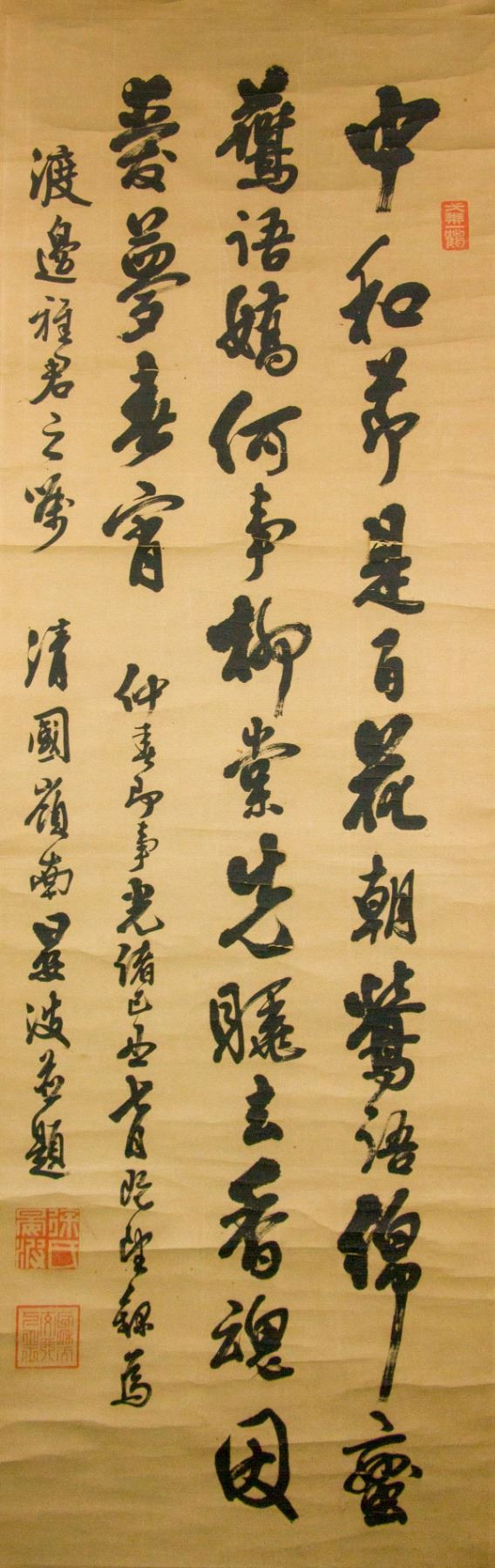 Ink on paper, hanging scroll. Featuring Chinese calligraphy in semi-cursive script. Signed Yan Bo 19th century Chinese, inscribed with 3 artist seals. 200 x 70 cm