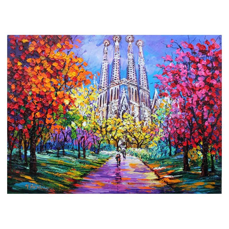 "A Day in Barcelona" is an original painting, acrylic on stretched canvas, by Yana Rafael. Hand signed by the artist, this piece is accompanied by certificate of authenticity and measures approximately 30" x 40".