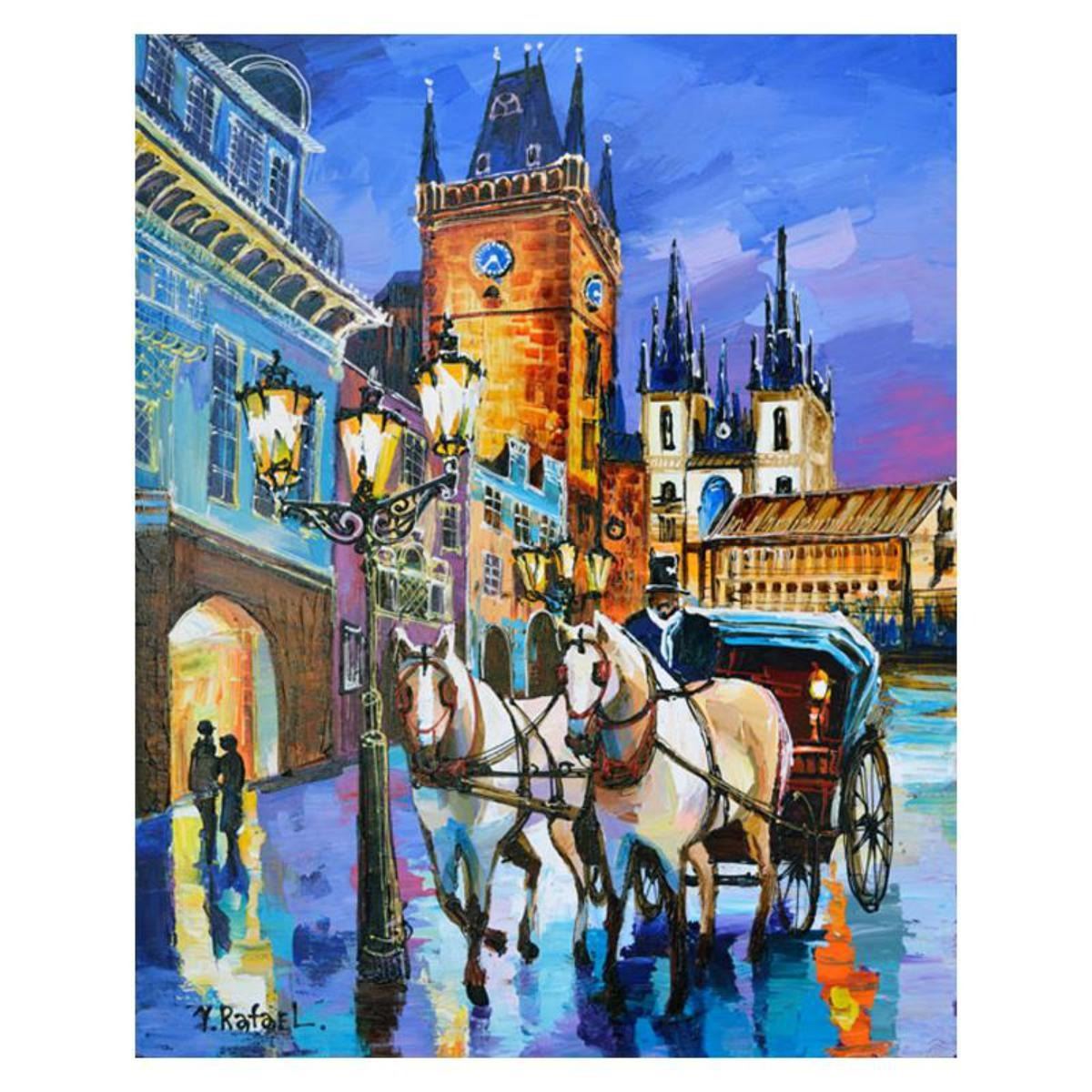 "Carriage Ride by the Clocktower" is an original painting, acrylic on stretched canvas, by Yana Rafael. Hand signed by the artist, this piece is accompanied by certificate of authenticity and measures approximately 30" x 24". Reference #: 245981