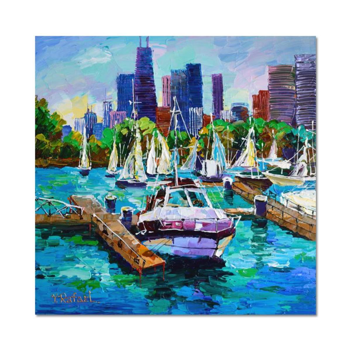 "City Boat Slip" is an oringal painting, acrylic on canvas, by Yana Rafael. Hand signed by the artist, this piece is accompanied by certificate of authenticity. Measures approximate 24" x 24" Reference #: 235975