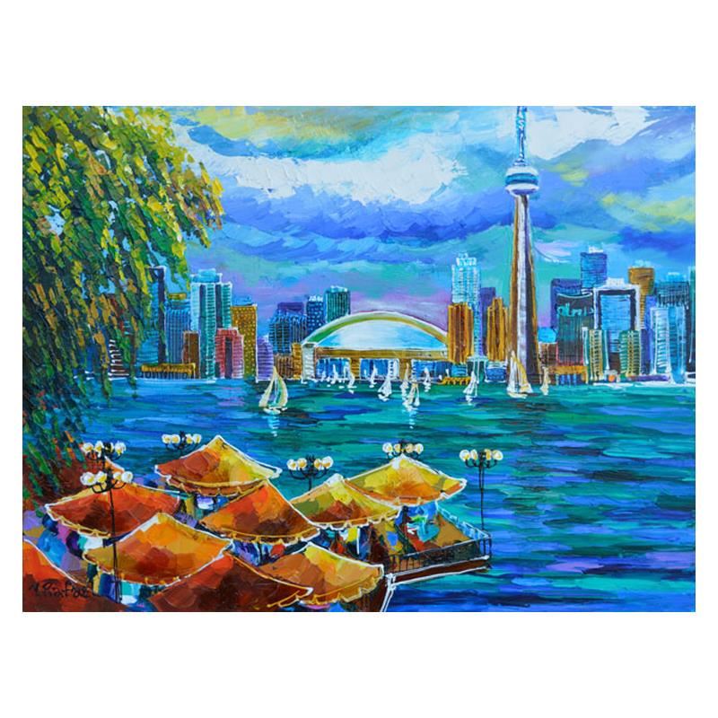 "Downtown Toronto" is an original painting, acrylic on stretched canvas, by Yana Rafael. Hand signed by the artist, this piece is accompanied by certificate of authenticity and measures approximately 30" x 40".