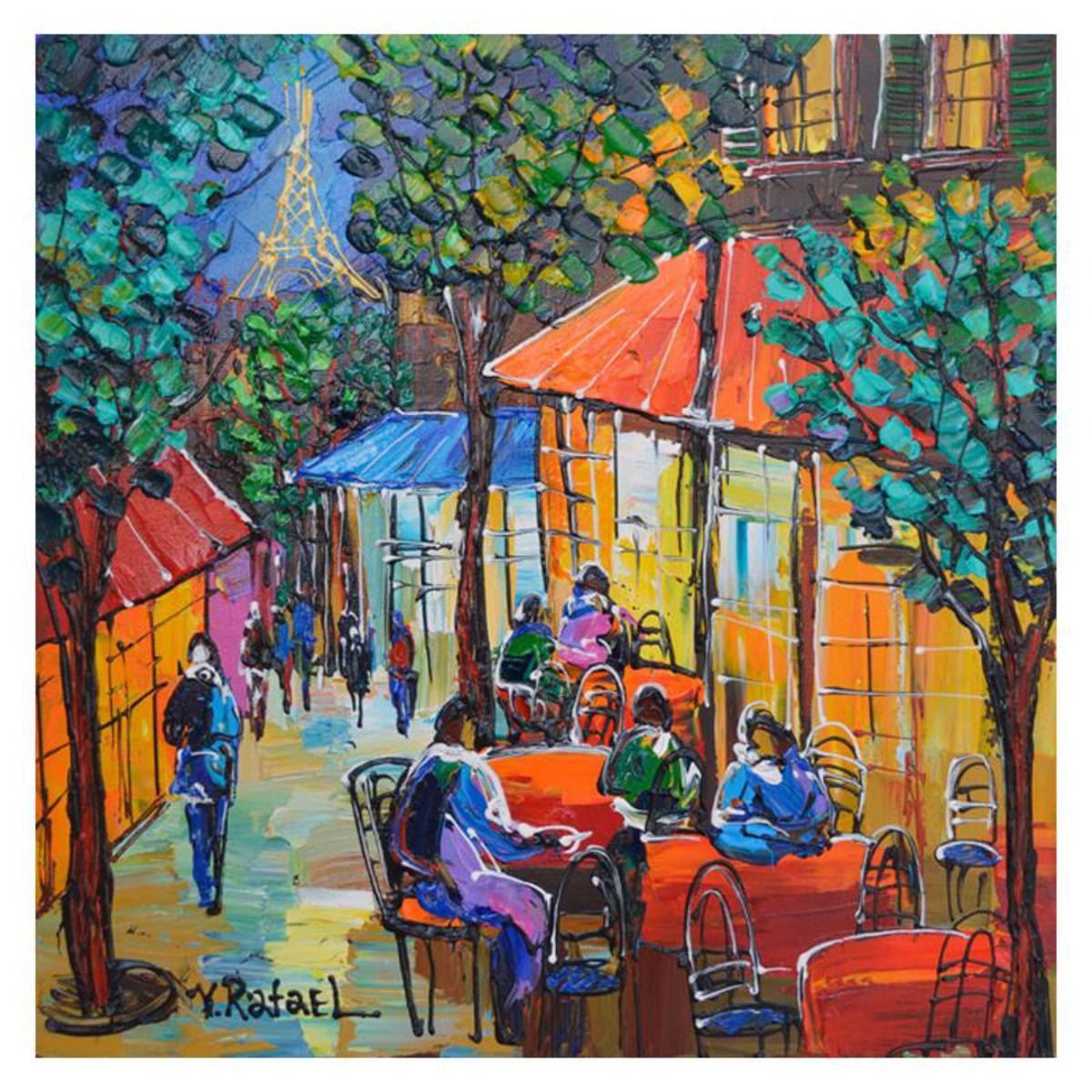 "Home Town Café" is an original painting, acrylic on stretched canvas, by Yana Rafael. Hand signed by the artist, this piece is accompanied by certificate of authenticity and measures approximately 20" x 20". Reference #: 245956