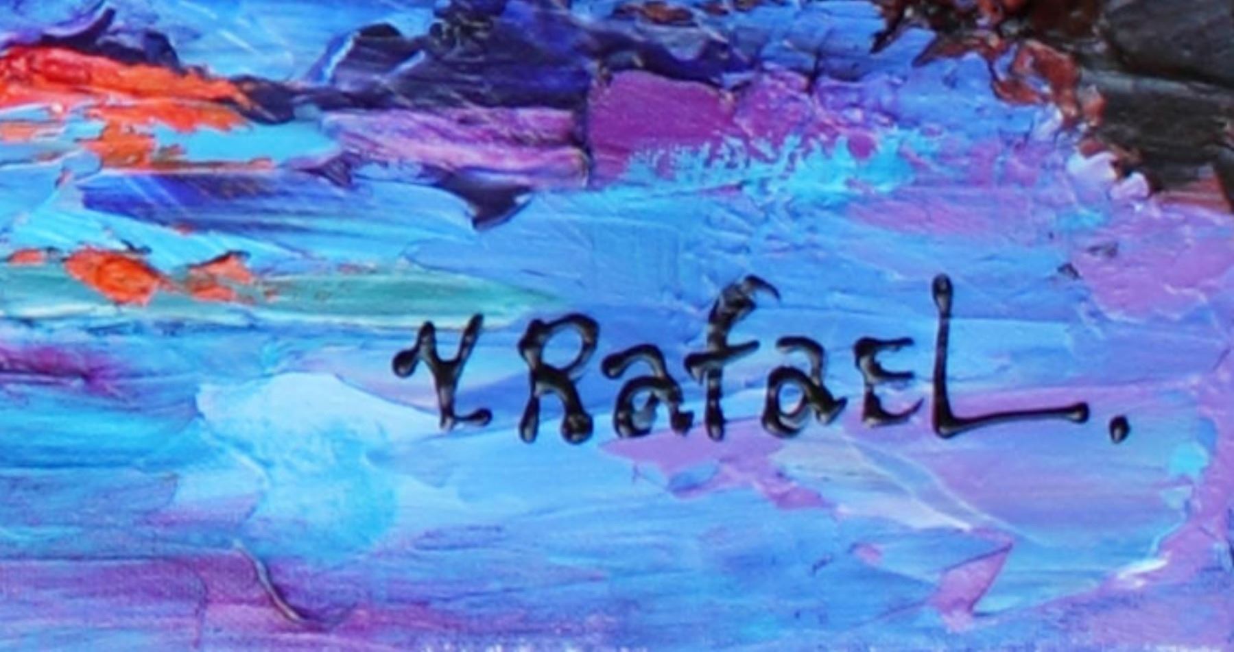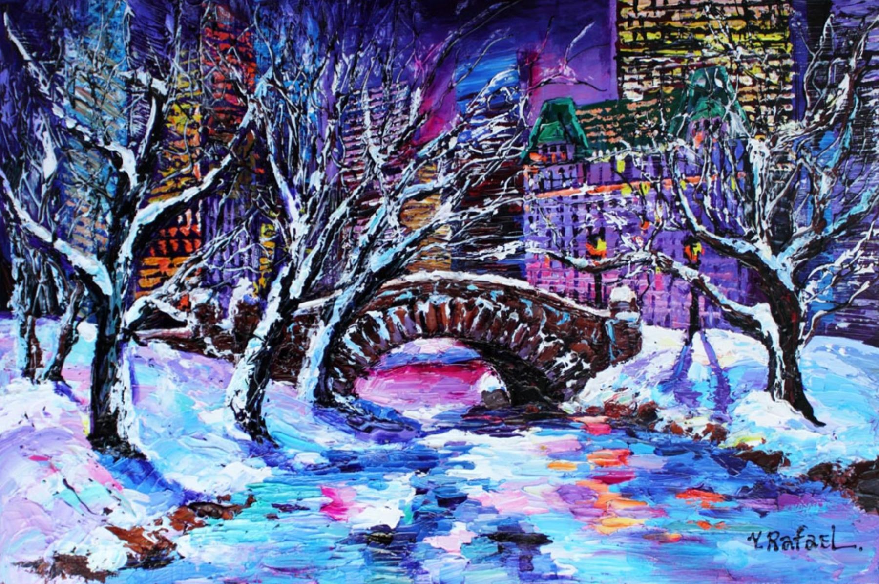 Artist: Yana Rafael - Title: Frosty Day in Central Park - Medium: Acrylic on Canvas - Signature: Hand-signed by the artist at the bottom of the image - Image Size: Approximately 24 inches x 36 inches - Framed: Stretched and Ready for Framing - Details: This work comes with a Certificate of Authenticity - Yana Rafael's style is full of vibrant colors and expresses emotions typically associated with bold life. When violent colors are next to each other they trick the eye into a sensation of movement.