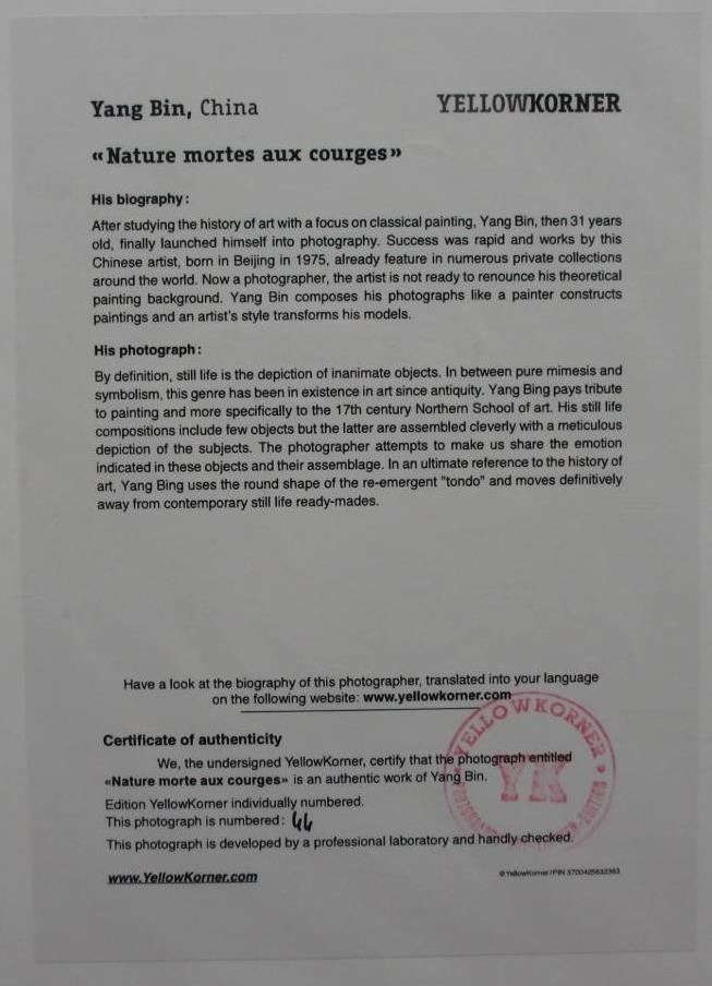 Nature mortes aux courges Certified Photograph, Yang Bin YellowKorner Certified Photograph. Certificate of Authenticity from YellowKorner affixed to the back. Matted Dimensions 16"x20". Protected with Clear Mylar Sleeve.