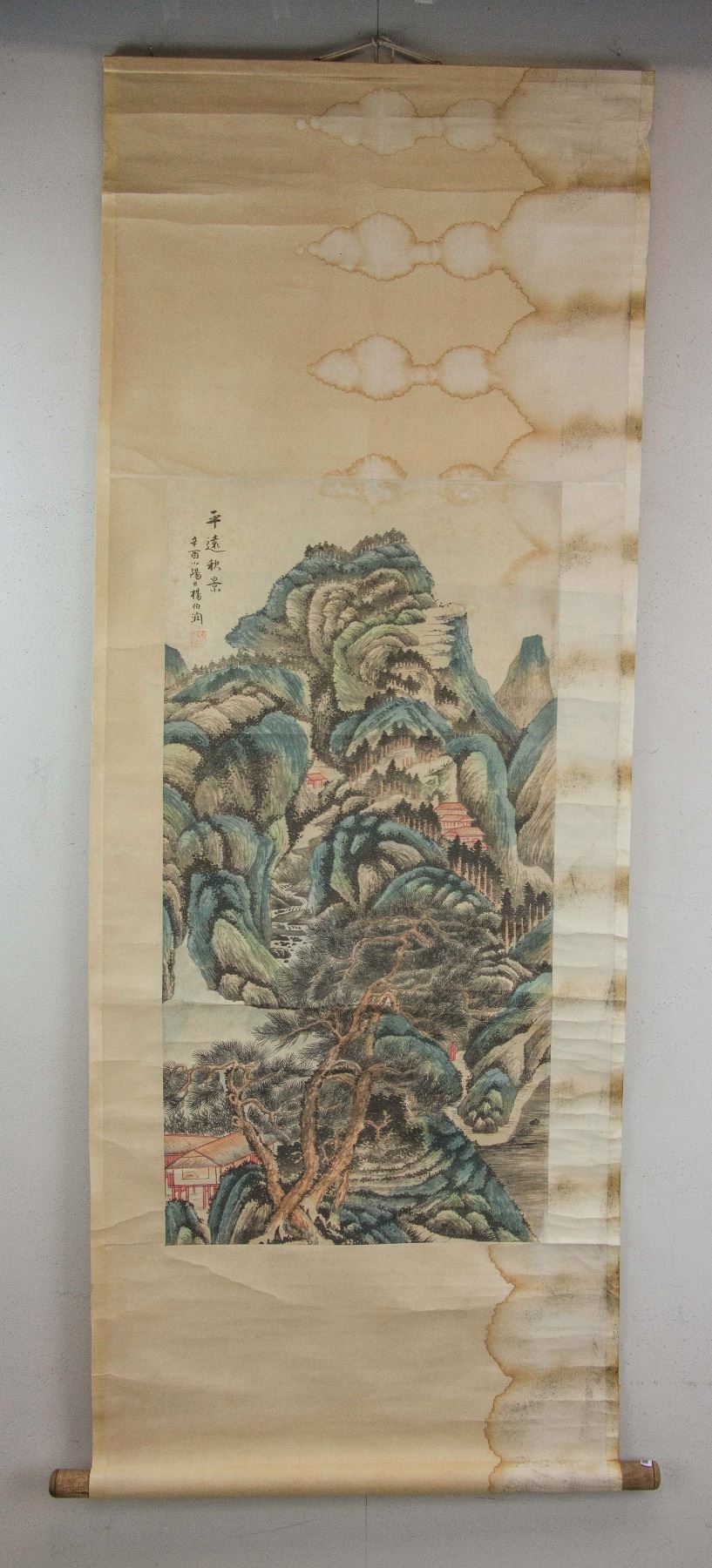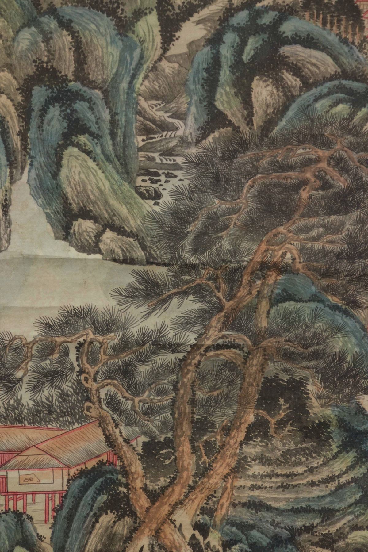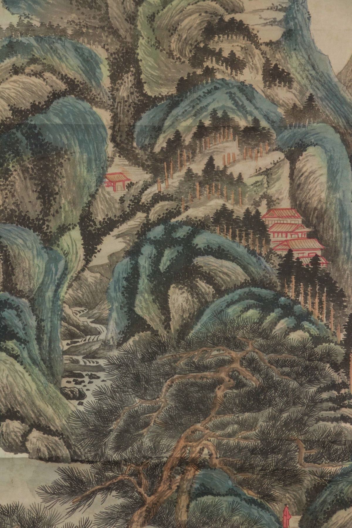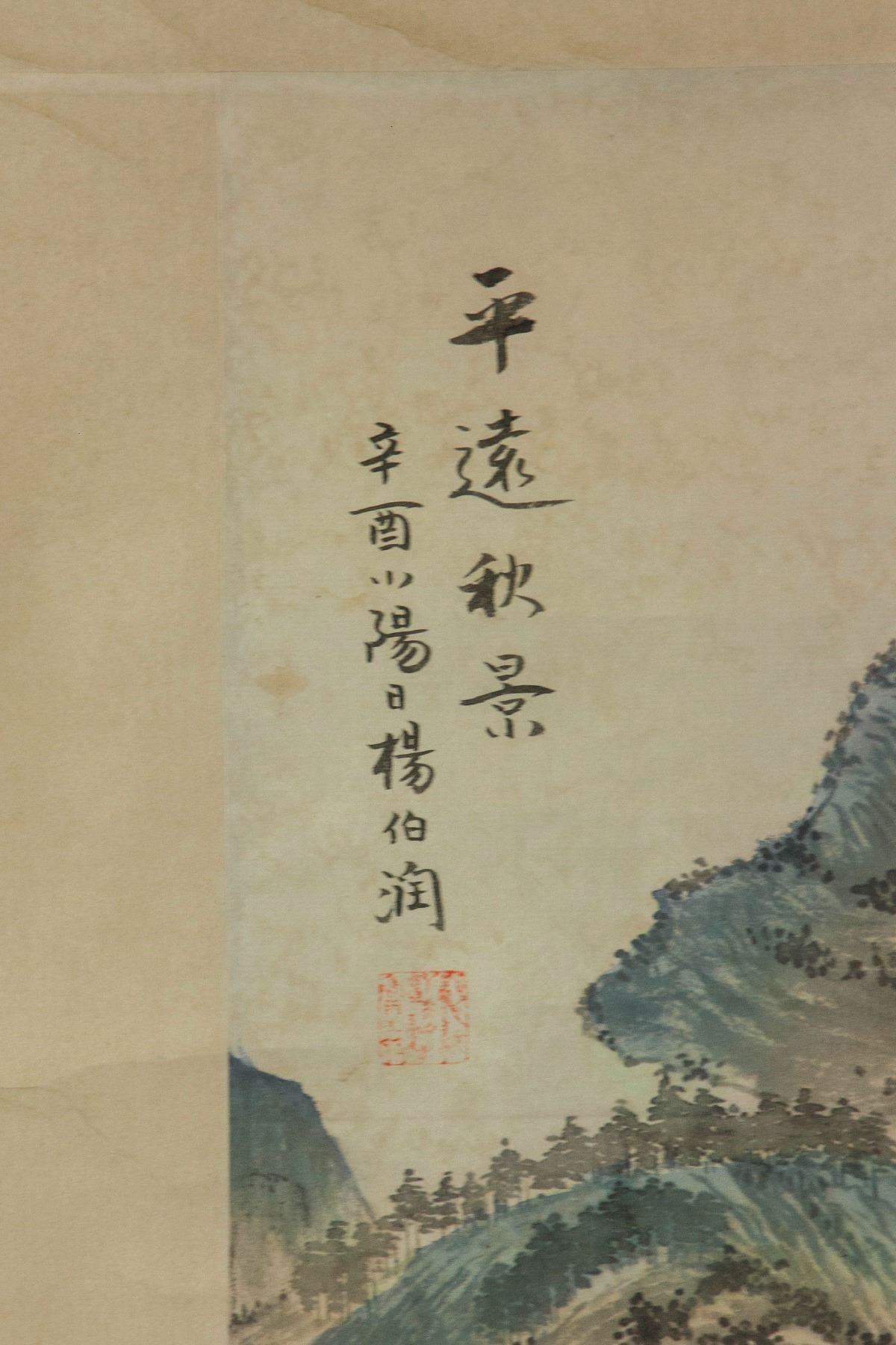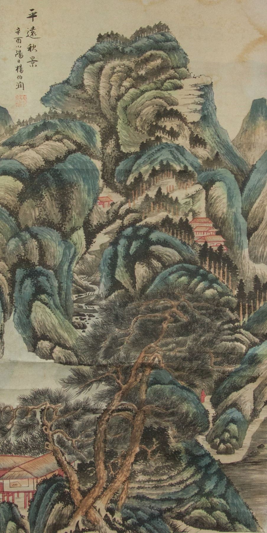 Mountainous landscape with temples; Chinese ink and watercolour on paper; hanging scroll; signed Yang Borun (1837-1911); inscribed with 1 artist seal; 89 cm x 45 cm