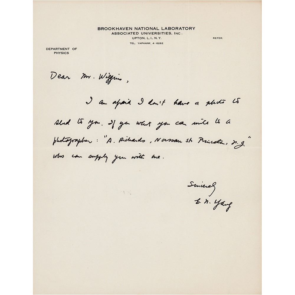 ALS signed “C. N. Yang,†one page, 8.5 x 11, Brookhaven National Laboratory letterhead, no date. Handwritten letter to "Mr. Wiggins," in full: "I'm afraid I don't have a photo to send to you. If you want you can write to a photographer: 'A. Richards, Nassau St., Princeton, N.J.,' who can supply you with one." In fine condition.