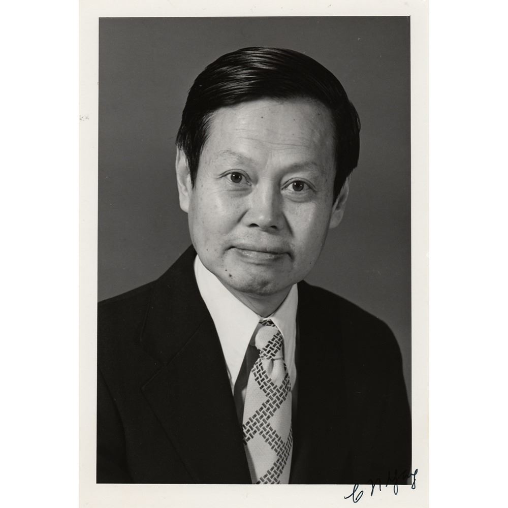 Chinese theoretical physicist (born 1922) who made significant contributions to statistical mechanics, integrable systems, gauge theory, particle physics, and condensed matter physics. Glossy 5 x 7.25 photo of Yang in a suit and tie, signed in the lower right corner in black felt tip, "C. N. Yang." In fine condition.