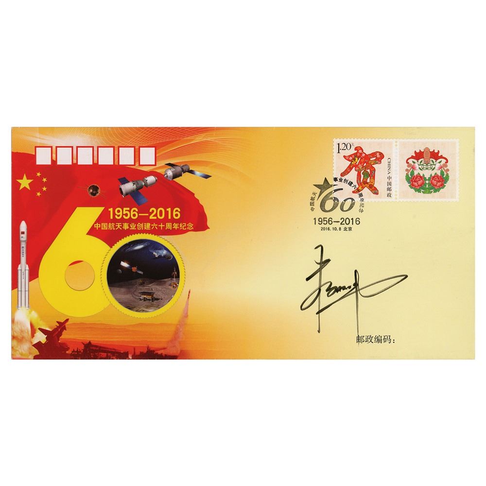 Colorful commemorative cover honoring sixty years of Chinese space achievements, signed in black felt tip by China's first taikonaut, Yang Liwei. In fine condition.