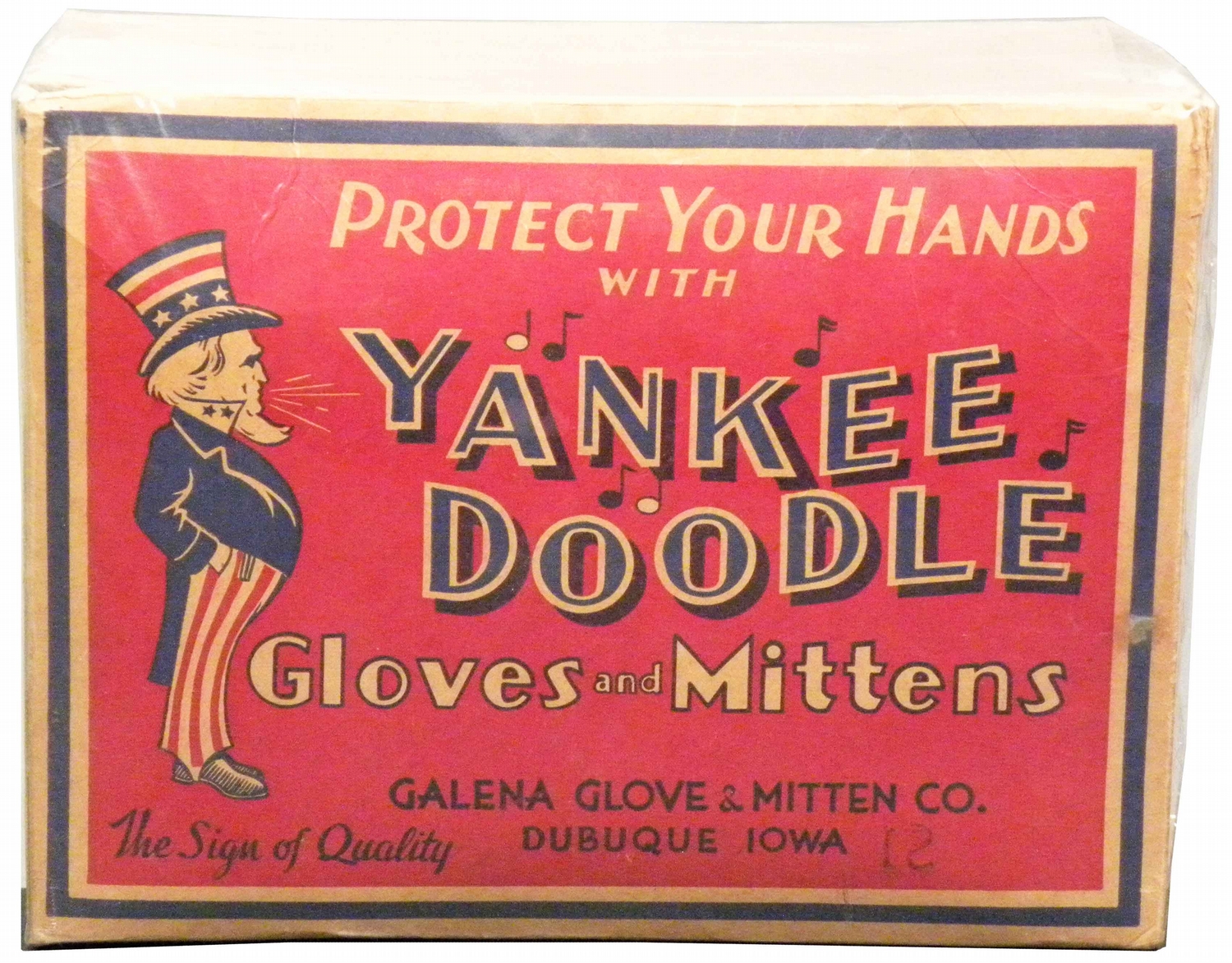 Yankee Doodle Gloves and Mittens Store Box. Galena Glove and Mitten Co. Dubuque, Iowa. Excellent condition. 10 1/2 X 8 X 5 1/2 inches.