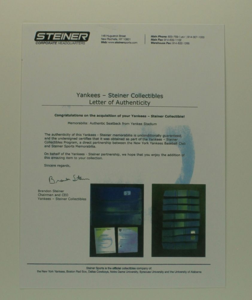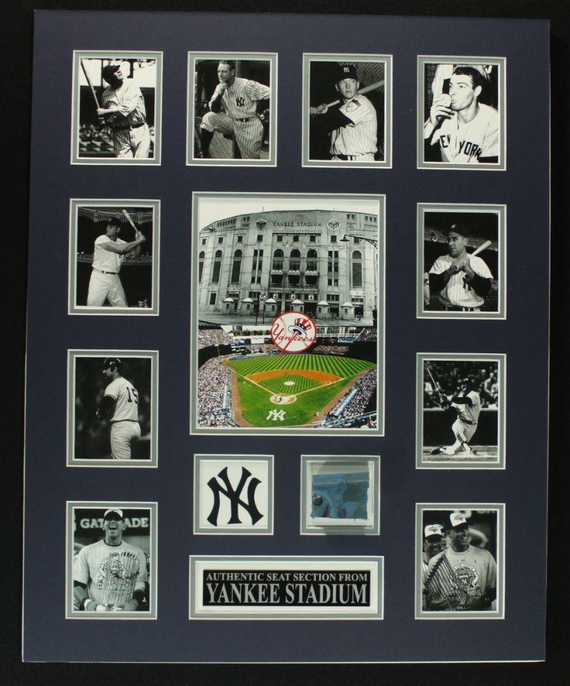 Custom matted piece which measures 16x20 in size. The piece is highlighted by a 2x2 section of authentic stadium seat which came directly from Yankee Stadium. The piece is not hand-signed. Includes a Steiner COA for authenticity purposes.