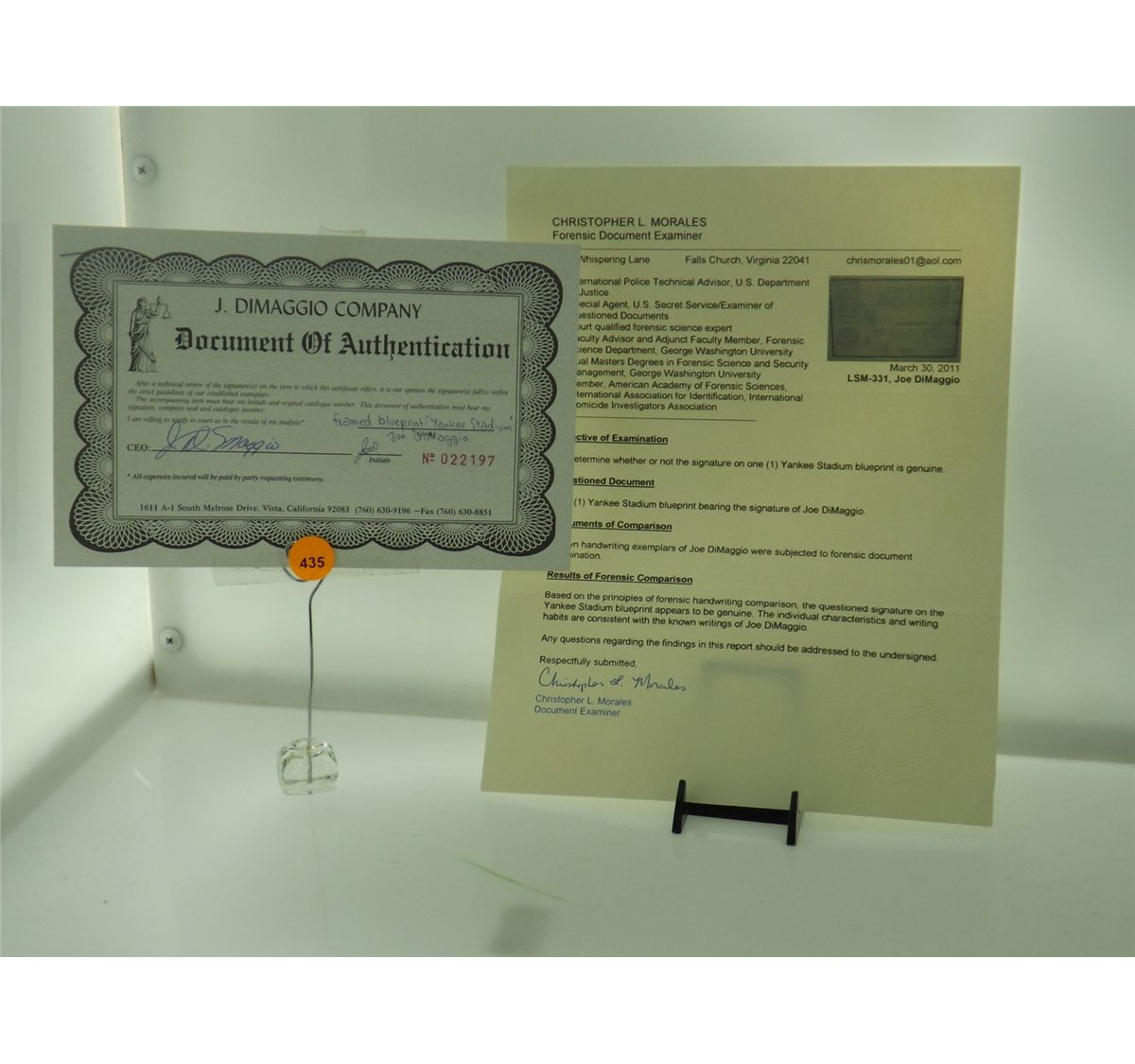 Yankee Stadium Blueprint Autographed by Joe DiMaggio. Framed and Matted 26x33 Lithograph of Yankee Stadium Blueprints Signed by Joe DiMaggio. Appraised or estimated retail value $2600. COAs by J. DiMaggio Co. and Christopher Morales. All Sales Final. Please see terms and conditions of auction.