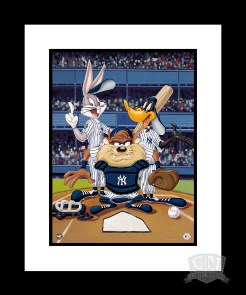 The 16x20 framed lithograph features Looney Tunes characters Bugs Bunny, Taz and Daffy Duck at the plate as Yankee players. Licensed. COA included.