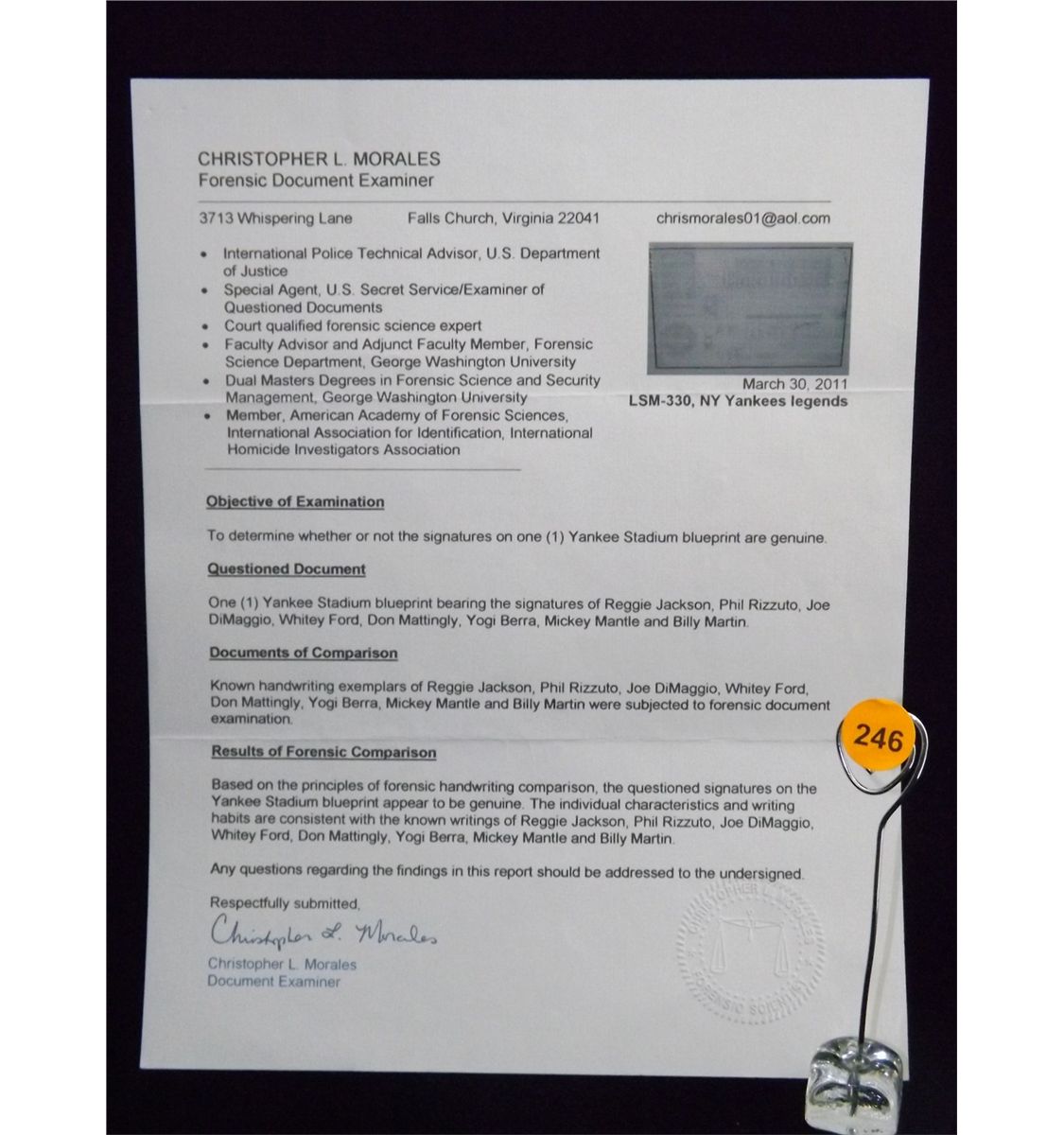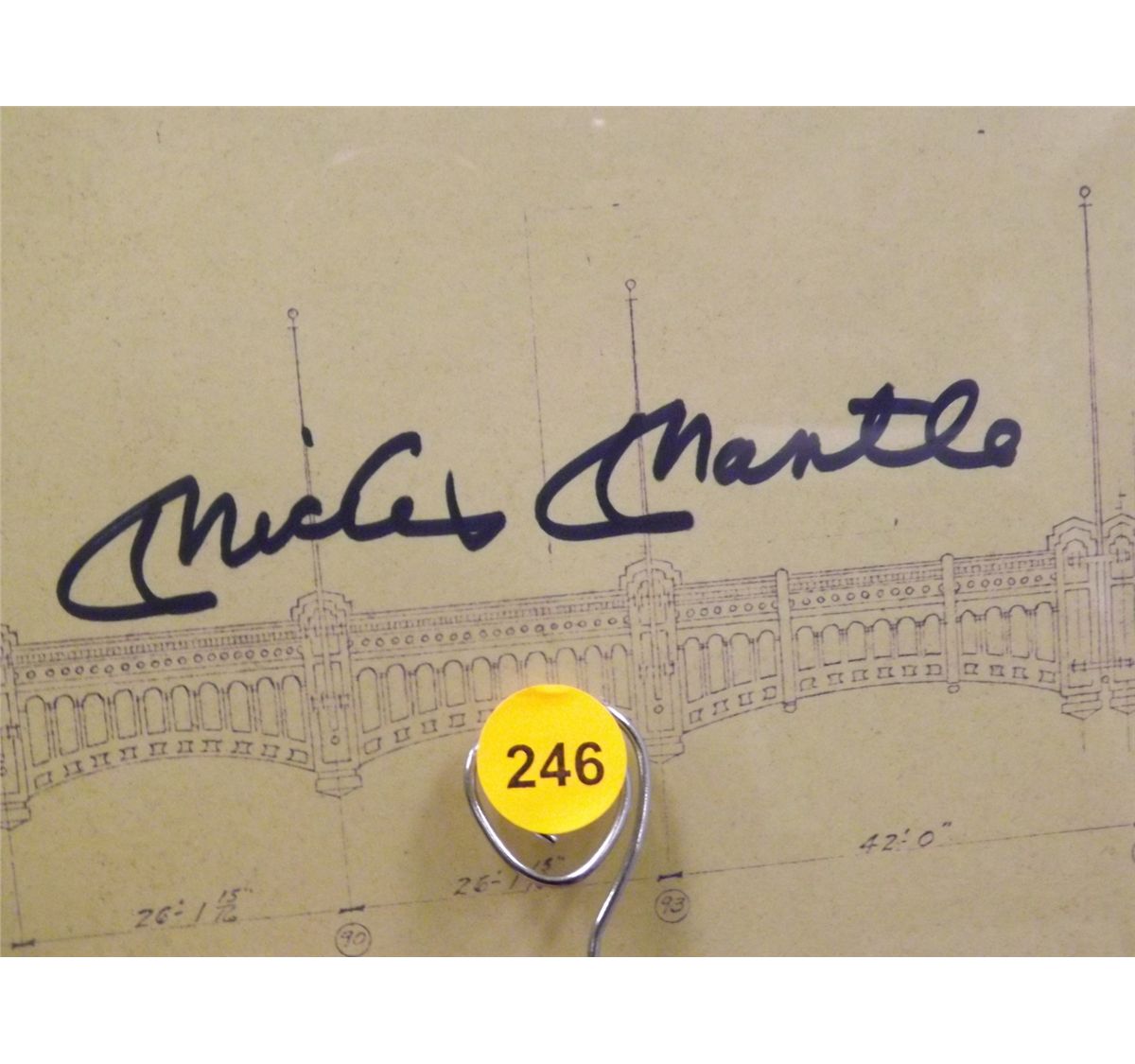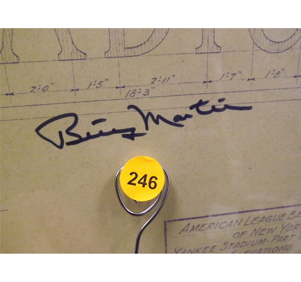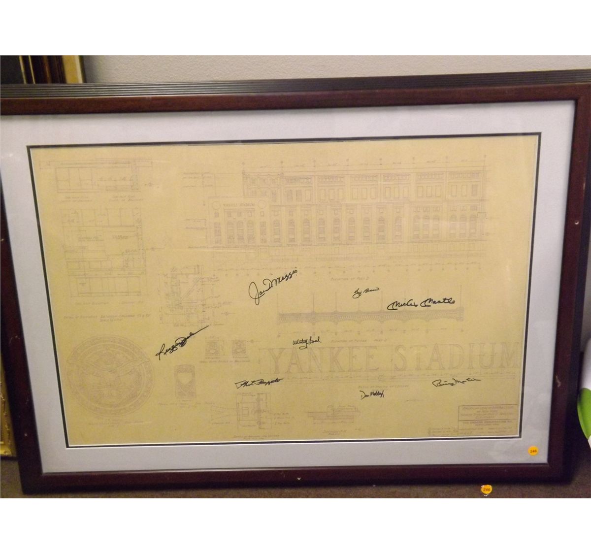 Yankees Stadium Blueprint Autographs. Framed replica Yankee Stadium Blueprints. Autographed by Reggie Jackson, Phil Rizzuto, Joe Dimaggio, Whitey Ford, Yogi Berra, Mickey Mantle, Don Mattingly and Billy Martin. Appraised or estimated retail value $2800. COA by Christopher Morales. All Sales Final. Please see terms and conditions of auction.