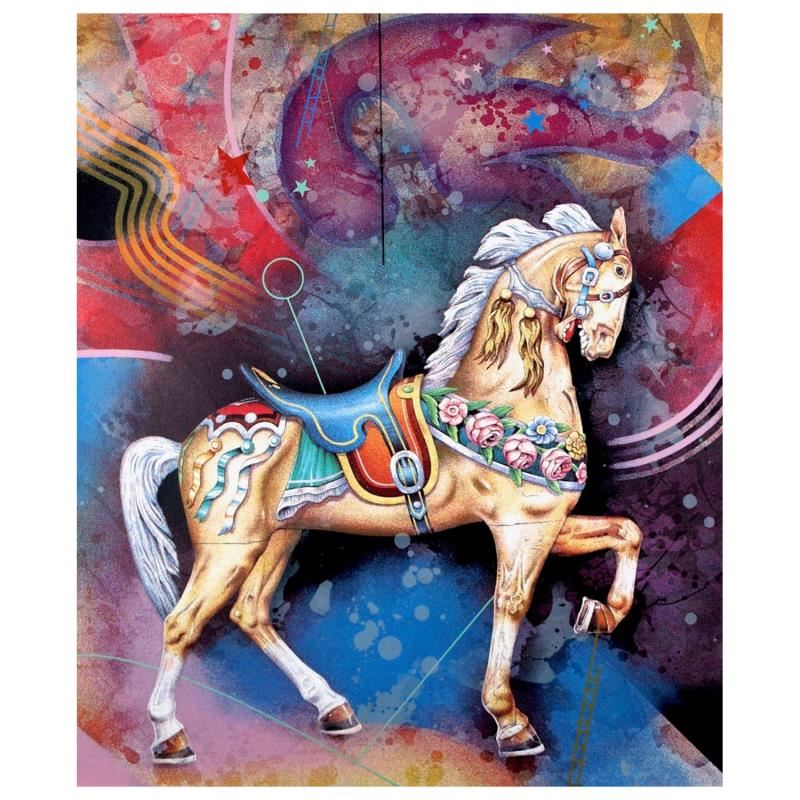 "Carousel" is a limited edition silk screen by Yankel Ginzburg. This piece is numbered, hand signed by the artist, and come with a letter of authenticity. Measures approximately 30" x 25.5" (image), 33" x 40" (with border).