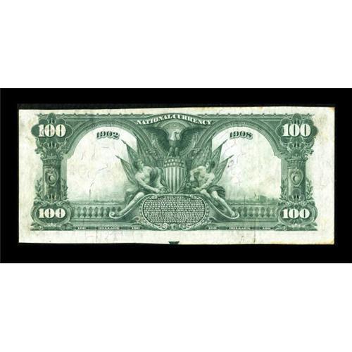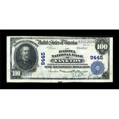 <B>Yankton, SD</B></I> - $100 1902 Date Back Fr. 691 <B>The Dakota NB</B></I> Ch. # 9445<BR> This is one of a rather small group of high denomination examples from this bank which has given collectors the opportunity to own a high grade South Dakota fifty or hundred. Listed in the census as AU, this note certainly looks the grade, but its folds compel us to be conservative and label it as <B>Extremely Fine. </B></I>There is a small paper clip mark on the back that must be mentioned for the sake of accuracy, even though it is not visible at all on the front. <BR><BR><b>Shipping:</b> Coins & Currency (<a target="_blank" href="http://www.heritageauctions.com/common/shipping.php">view shipping information</a>)