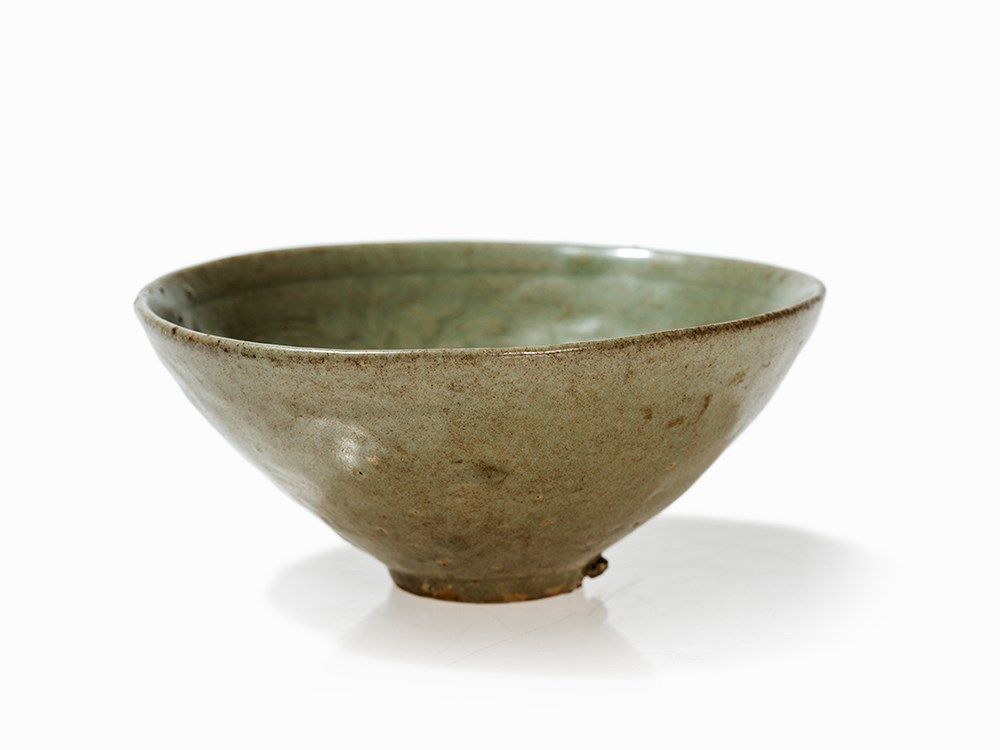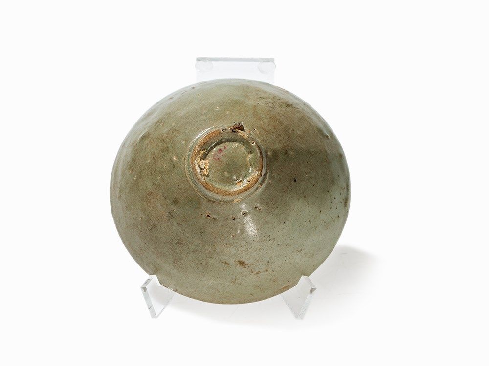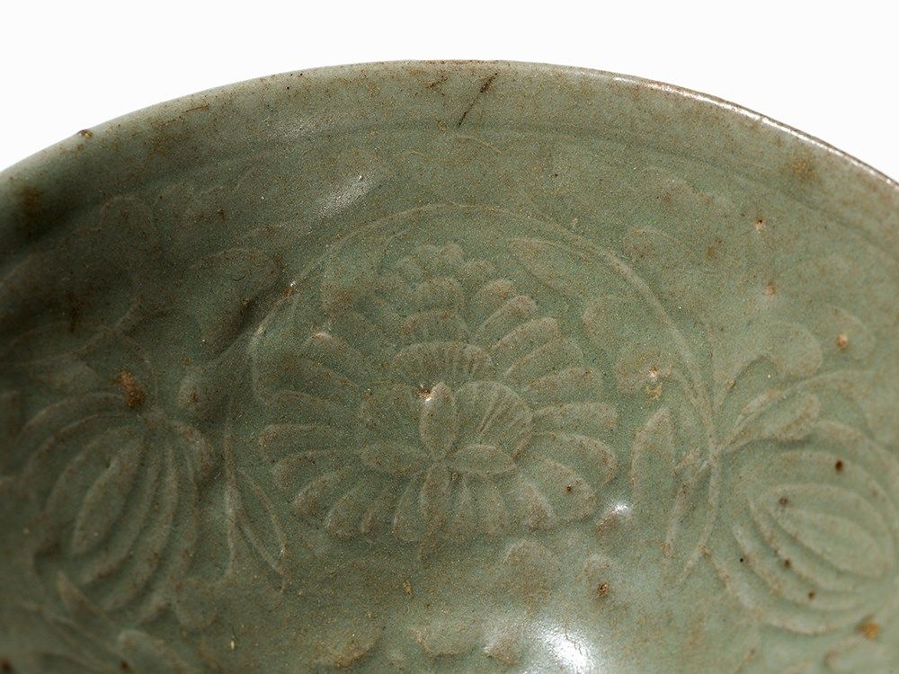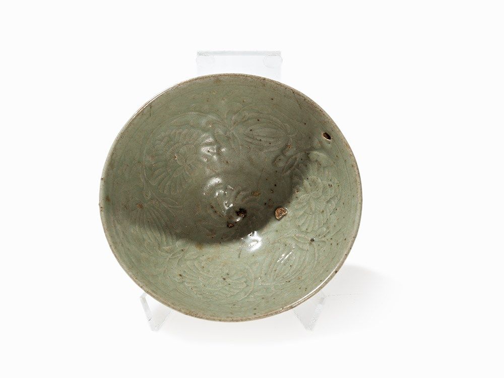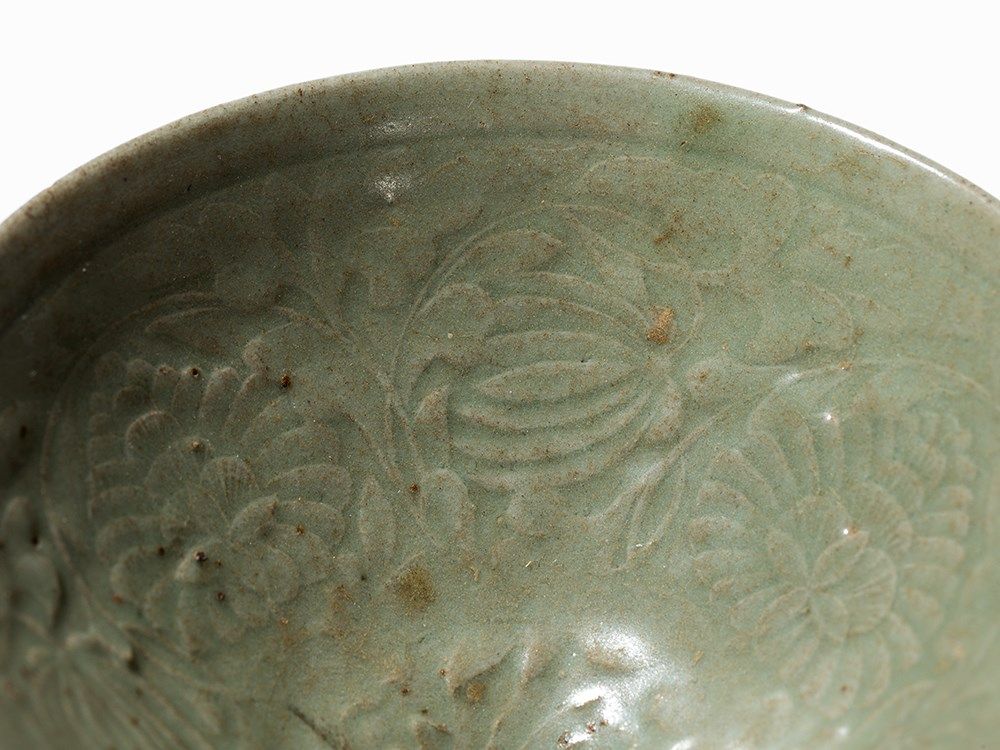 Yaozhou is a type of Song ‘greenware’, also known as ‘Northern celadon’. The Yaozhou kilns were among the most famous ‘celadon’ kilns in China and flourished during the Northern Song Dynasty. Yaozhou ware is characterized by a slightly translucent olive green glaze over a light gray body. Typical vessels of Yaozhou celadon porcelain were green glazed bowls, plates, saucers, glasses, vases, small bottles and cups, which were decorated with dragons, phoenixes or floral patterns. The decoration was usually incised or impressed.