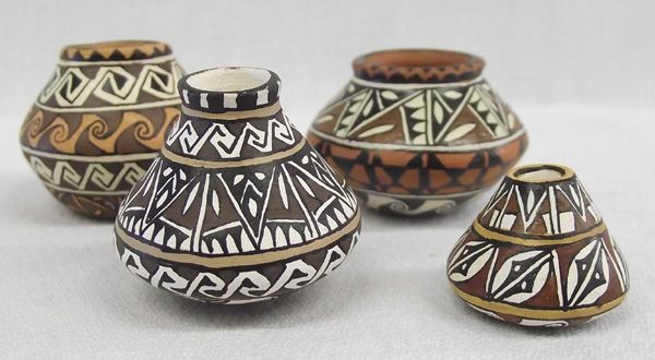 Yaqui Miniature Polychrome Pottery Jars, hallmarked, beautifully painted jars features both geometric and abstract designs, mahogany-black-white eyedazzling designs, largest measures .75''H x 1.5''W, The Pascua Yaqui Tribe is a federally recognized tribe of Yaqui Native Americans in southern Arizona. Descended from the ancient Uto-Azteca people of Mexico, the ancestors of the Pascua Yaqui Tribe first settled in the United States near Nogales and south Tucson. In the late 19th century, the tribe began to expand into settlements north of Tucson in an area they named Pascua Village, and in Guadalupe, near Tempe.