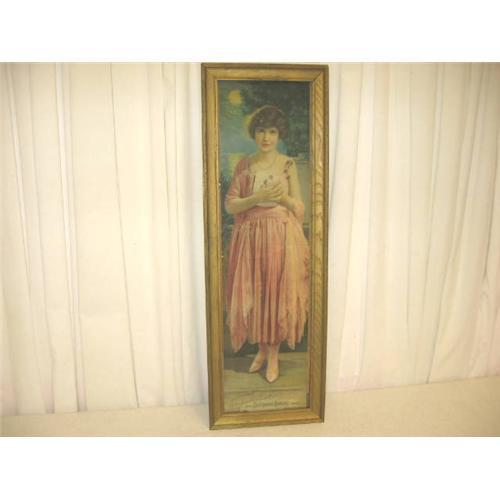 We have for sale a hard to find yard long advertising print "1921" Pompeian Beauty "Absence Cannot Hearts Divide". It is signed "Sincerely Marguerite Clark" Copyright Pompeian Co. What is great, it has advertisement on the back promoting Pompeian Products and a calender for the year of 1921. There is a crease in the print near the bottom where it had been folded at one time. The antique frame looks to be oak and had been painted gold. The measurements of the print is 27 5/8" by 7 1/8" and the over all measurements of the frame is 30 1/8" by 10 1/8" by 1 1/4" and weighs 4 pounds. We should be able to ship to Canada and some countries overseas. The girth will be approx. 93 inches and weigh approx. 10 pounds.